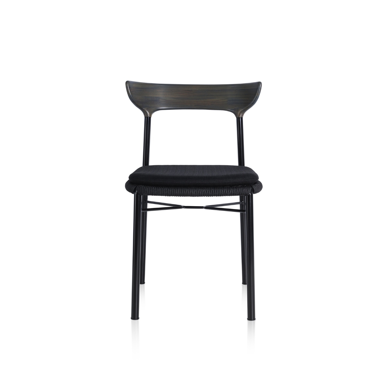Structure: Metal, electrostatic painting Seat: Nautical rope, upholstered in fabric Backrest: Solid wood, stained solid wood Ring: Metal, electrostatic painting