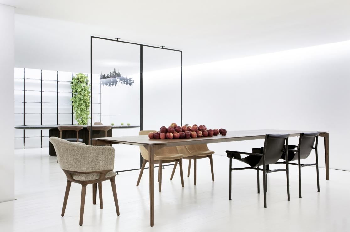 A slender chair, made of just two materials: metal and leather. The materials and sleek lines evoke traditional Brazilian modernist furniture.
