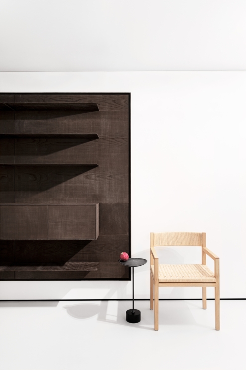 A friendly play. Rectilinear, its details are subtle and well-resolved, with a paper-weave seat and back, with a proportion that makes it harmonious and elegant.