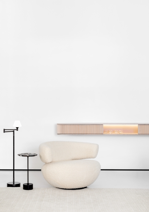 The armchair has an organic, thought-provoking and sensual shape, as well as generous proportions and comfort, which allow for countless interpretations of uses and relates to architecture and everyday objects.