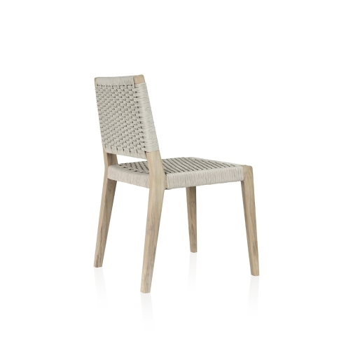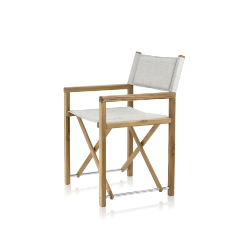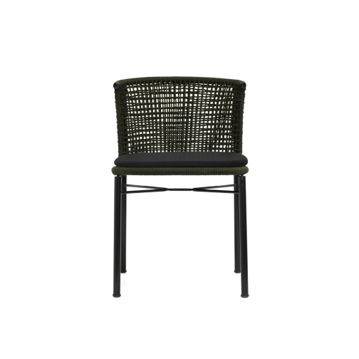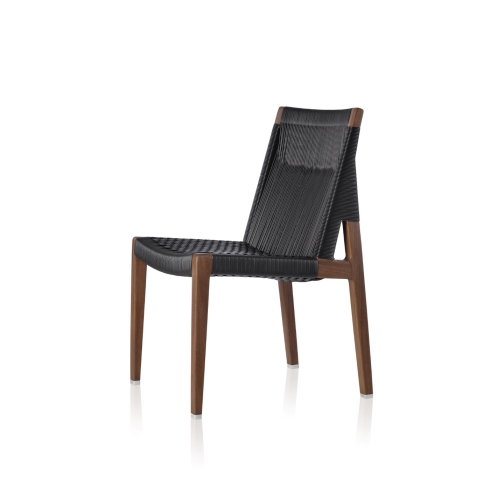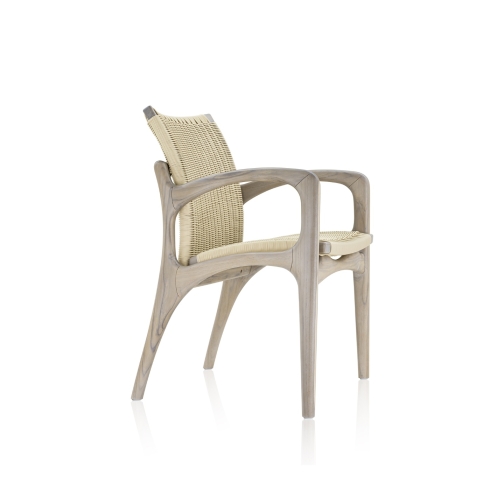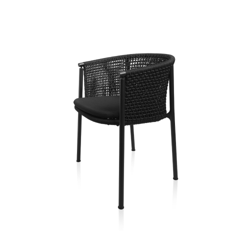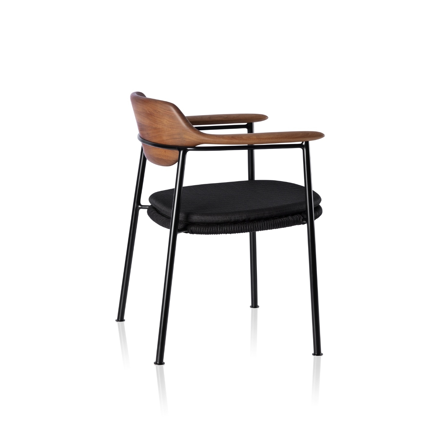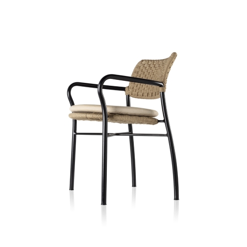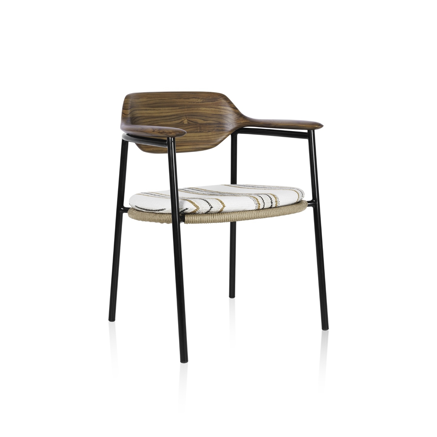 Structure: Metal, electrostatic painting Backrest: Solid wood, stained solid wood Armrests: Solid wood, stained solid wood Seat: Nautical rope, upholstered in fabric