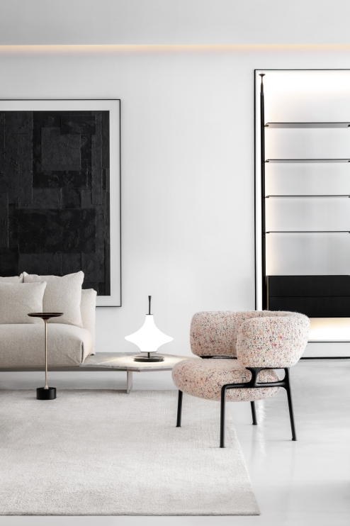 The visual harmony, the result of the balance of masses and a perfect circular geometry, make the piece sophisticated and elegant. The voluminous seat instigates by being surrounded by the metal structure, while the backrest supports the back and arms for the comfort of those who sit on it.