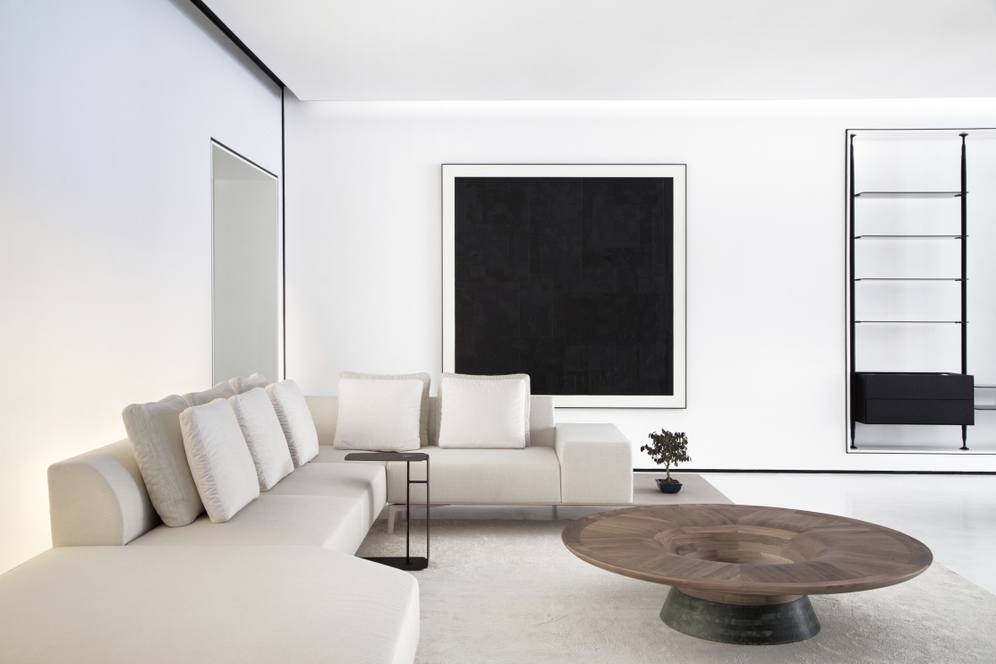 With a laminated structure in carbon steel, it has a displaced rod in brass which allows the piece to be attached to a sofa, bench, bed or armchair. The design is light, straight and contemporary.