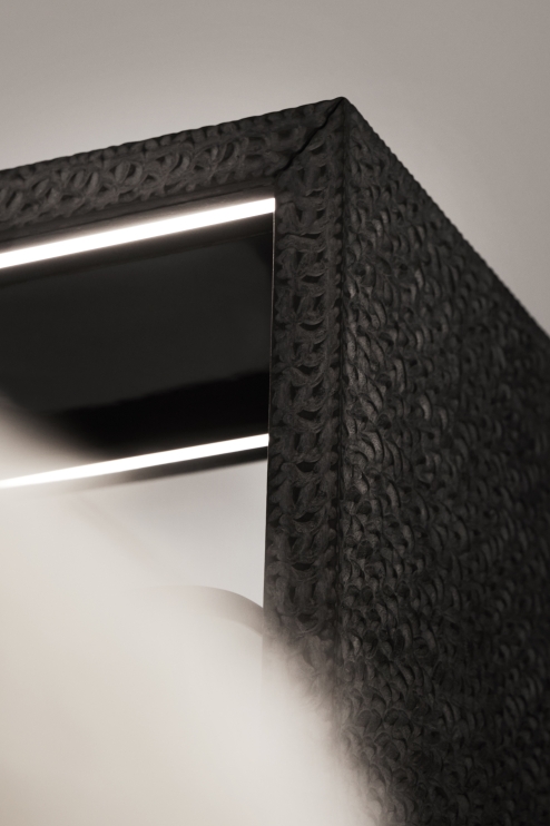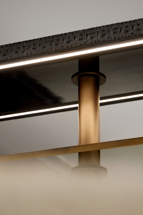 Its straight lines and hollow sides make it a versatile product for different interpretations and uses, with an exquisite Carved finish – made manually by artisans – on all external surfaces. Internally, it can be covered in leather, suede or even lacquer and receive boxes and trays in wood, marble and also in different finishes, including the unusual mirror.