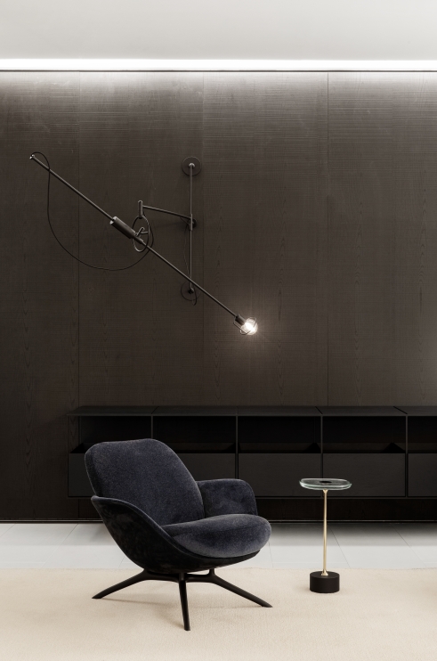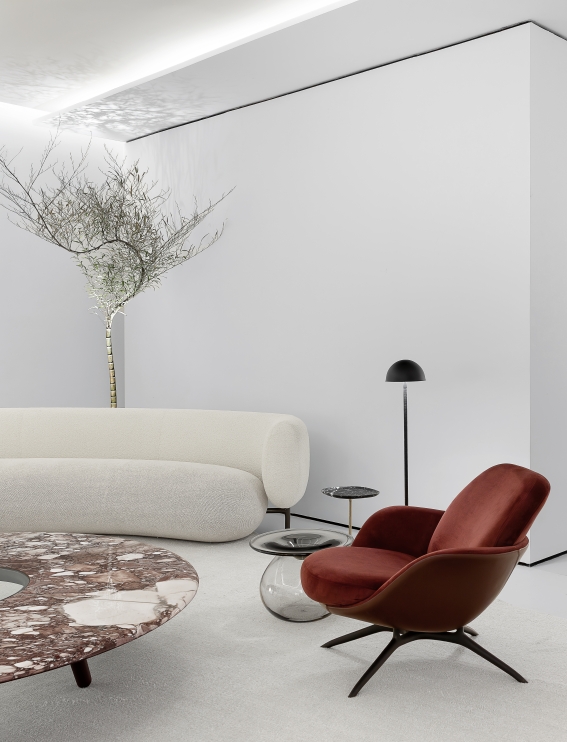 The futuristic and retro inspiration is evidenced by the lines of this lounge chair. The subtle and precise silhouette conveys a feeling of comfort and intimacy. The shell shape - a synonym for coziness - provides a comfy seat. The finish can be combined with different types of fabrics and leathers, in contrast to the base in solid or metallic colors. An elegant and striking piece totally focused on comfort.