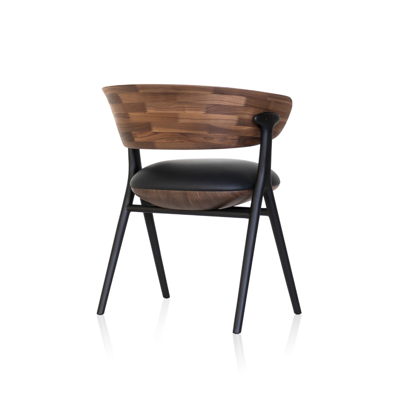 A chair with sophisticated and elegant geometry, created from an unusual arrangement of supports made of cast metal in a harmonious composition of materials. The upholstered seat appears to float while the backrest supports the back and arms for the comfort of the person sitting in it.