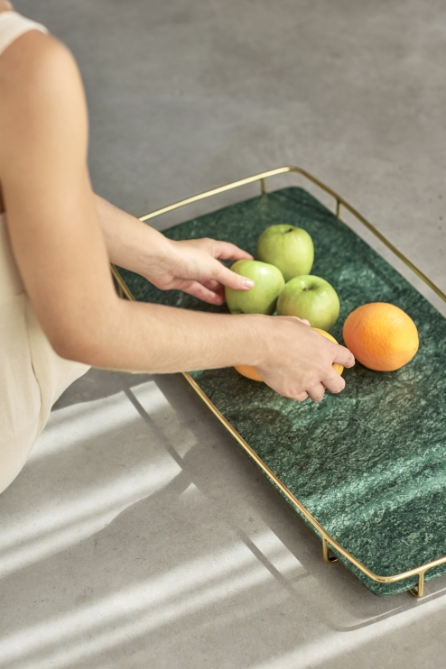 A tray with a delicate finish, reminiscent of a piece of jewelry. The timeless design, a hallmark of designer Jader Almeida, and the noble materials used in its composition inspire beyond the piece's functionality.