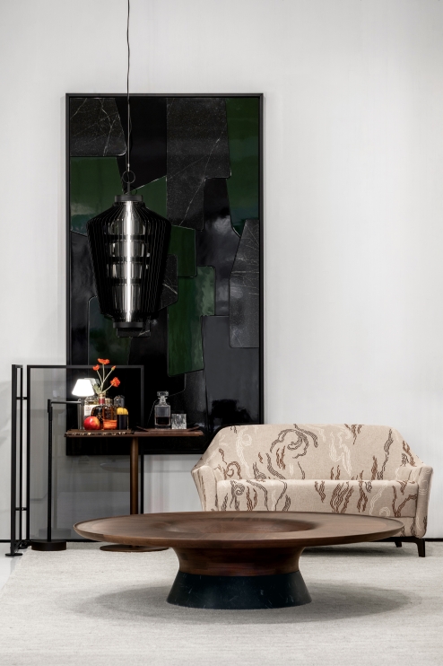 The PINE collection evokes an organic and suspended element, where a central core expands acrylic fins arranged radially. These fins, which can be transparent, frosted, or in a smoked tone, create different nuances and luminous atmospheres. The circular repetition of these layers not only defines its structure but also generates an intriguing optical illusion effect.