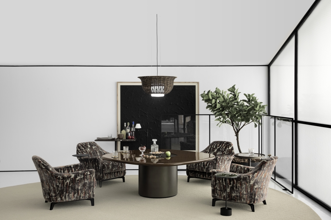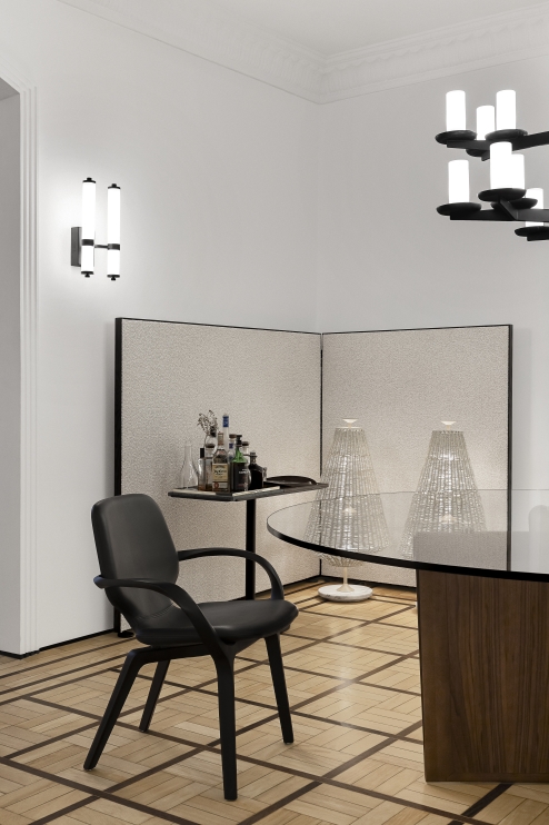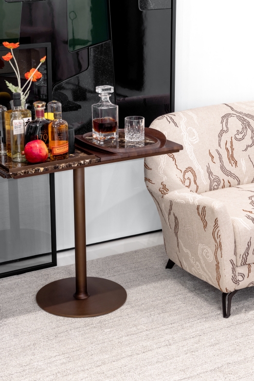 Derived from the SETTE system launched in 2022, the bar has a steel channel structure, which supports different elements, such as a tray and containers in a multitude of materials, such as wood, marble, leather, brass or steel. While its central tubular structure covered in rope gives lightness to the set, its modular surface denotes versatility. A delicate and functional proposal for the traditional bar support.