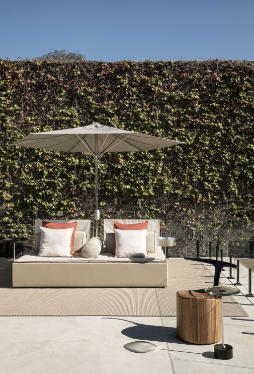 Functionality, flexibility, and individuality define the Villa platform. Villa is the product of a concept that arose from the need for collective use in outdoor spaces, such as a hotel, a club, or even a home. Even in collective settings, individuality is crucial, and the platform provides this perspective of use, offering flexible accessories such as supports, dividers, backrests, mats, a cabana, and umbrellas, allowing people to create their own solutions and adapt them to their needs and the times of day.