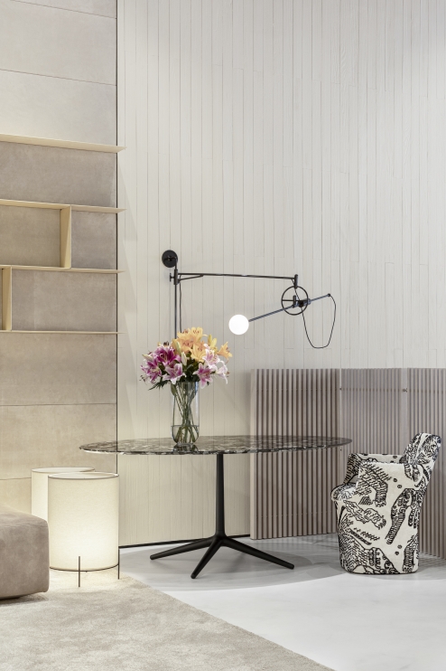 Penn alude al equilibrio y lo presenta en su construcción formal. Un conjunto de líneas armoniosas y elementales, delicadamente unidas como piezas de joyería. Fijada por una varilla, se apoya en un contrapeso y puede girar y moverse suavemente hacia arriba y hacia abajo. La bombilla de filamento, que recuerda a las antiguas bombillas de Thomas Edison, complementa el diseño atemporal.