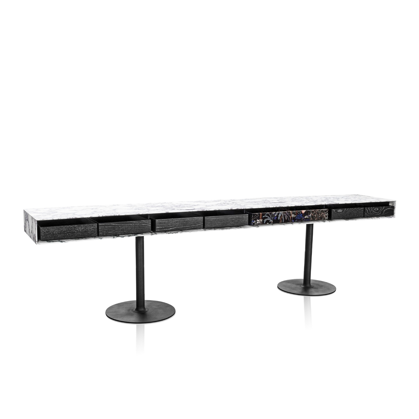 Estrutura externa: Mármore Estrutura interna: Lâmina natural, lâmina tingida Base: Laca, pintura especial, metalizado Caixa: Lâmina natural, espelho, revestido em tecido ou couro