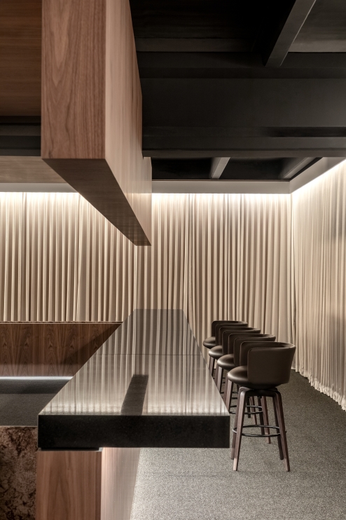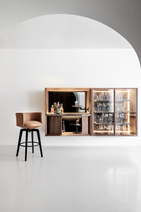 A banqueta se comunica de forma clara ao estilo atual sob a estética atemporal. Quando em uso, o conforto é garantido pela formatação anatômica da concha e pela composição estofada que abraçam o corpo.