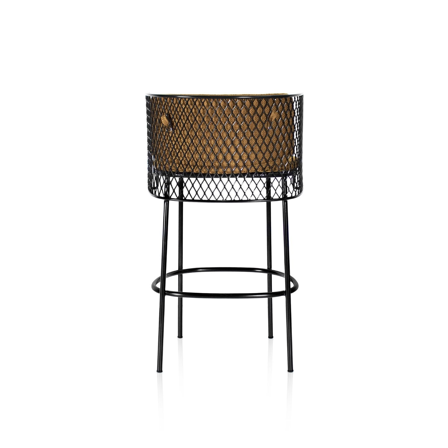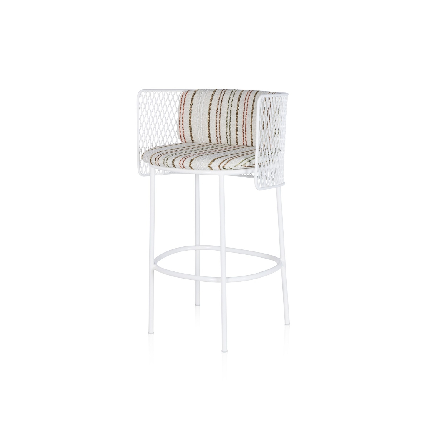 Estrutura: Metal, pintura eletroestática Braços: Metal, pintura eletroestática Assento e encosto: Metal, estofado revestido em tecido ou couro, pintura eletroestática