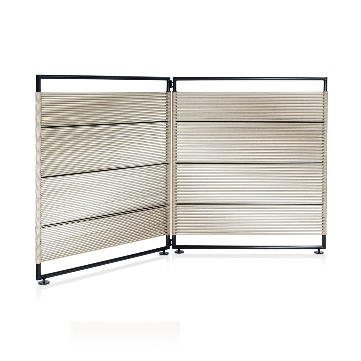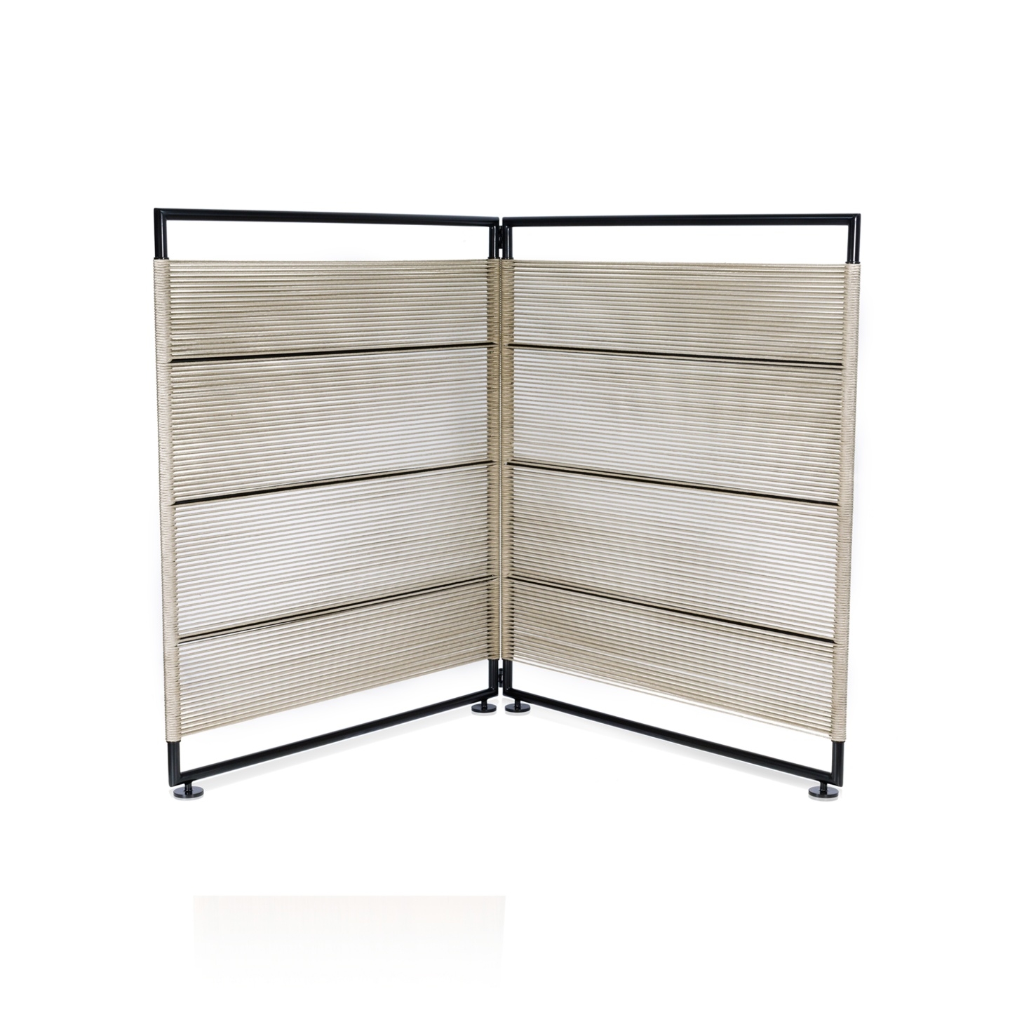 O biombo Brih, é um desdobramento da coleção que leva seu nome, elegante e funcional, se adapta a qualquer espaço interno ou externo. Enquanto sua estrutura em alumínio ou aço confere resistência e durabilidade, seu revestimento em corda náutica denota leveza e permeabilidade visual parcial.