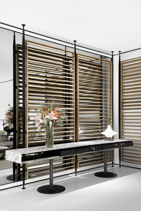 Sua composição de ripas de madeira, dispostas de forma horizontal e vertical, cria um jogo de transparências que sugere uma cortina arquitetônica, sutil e envolvente.