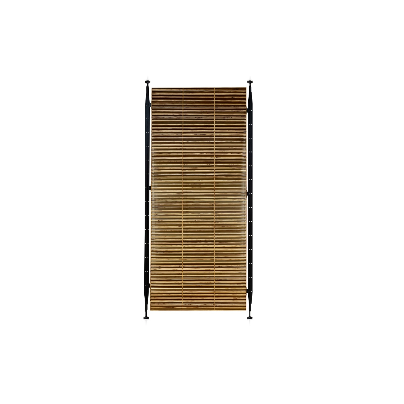 Sua composição de ripas de madeira, dispostas de forma horizontal e vertical, cria um jogo de transparências que sugere uma cortina arquitetônica, sutil e envolvente.