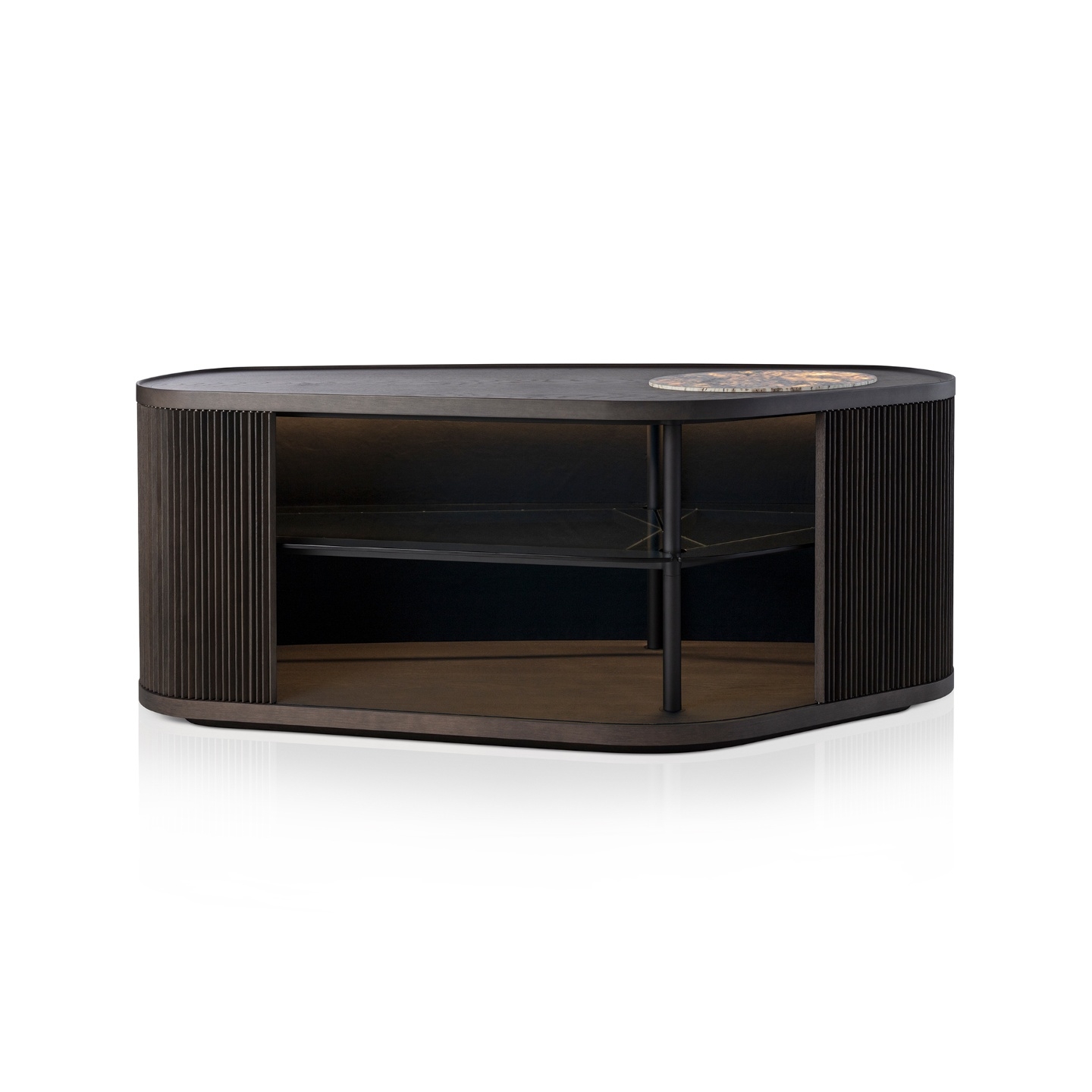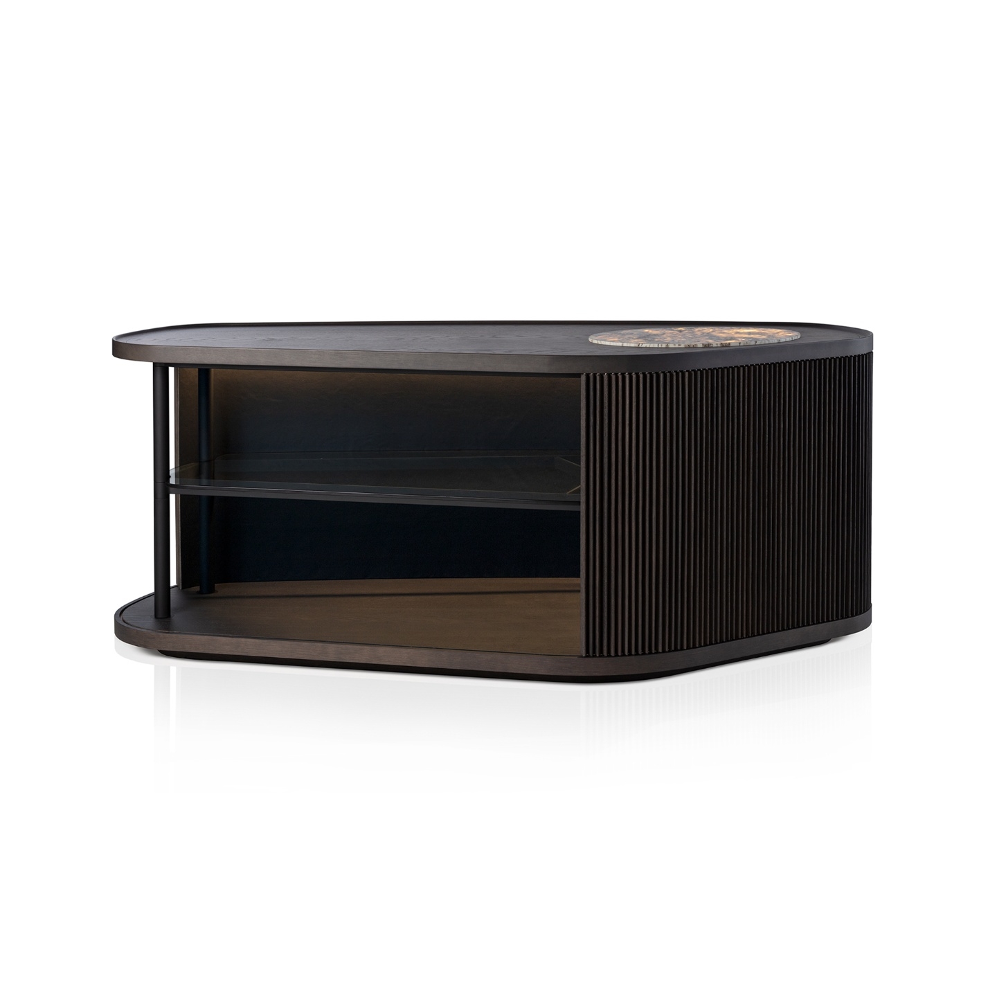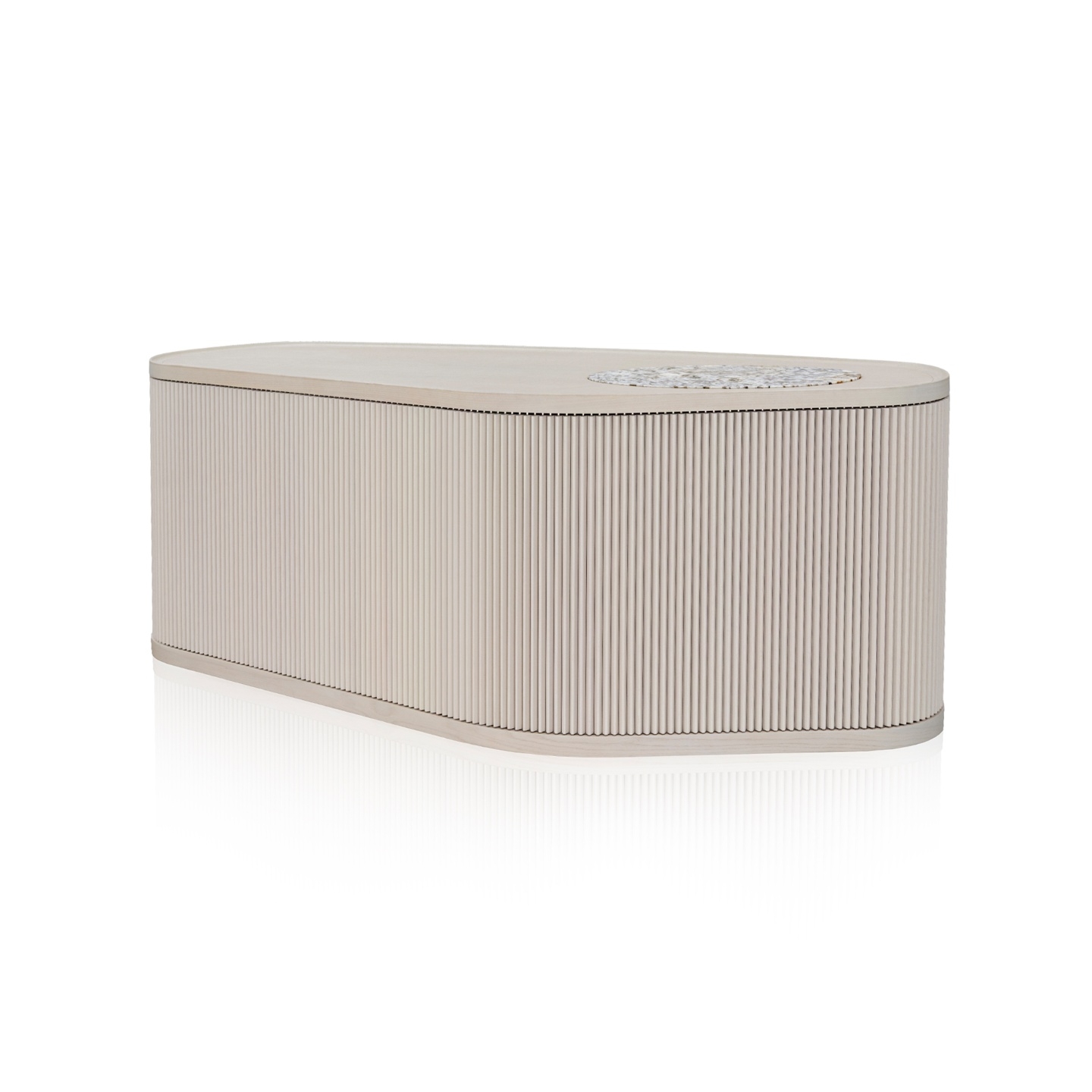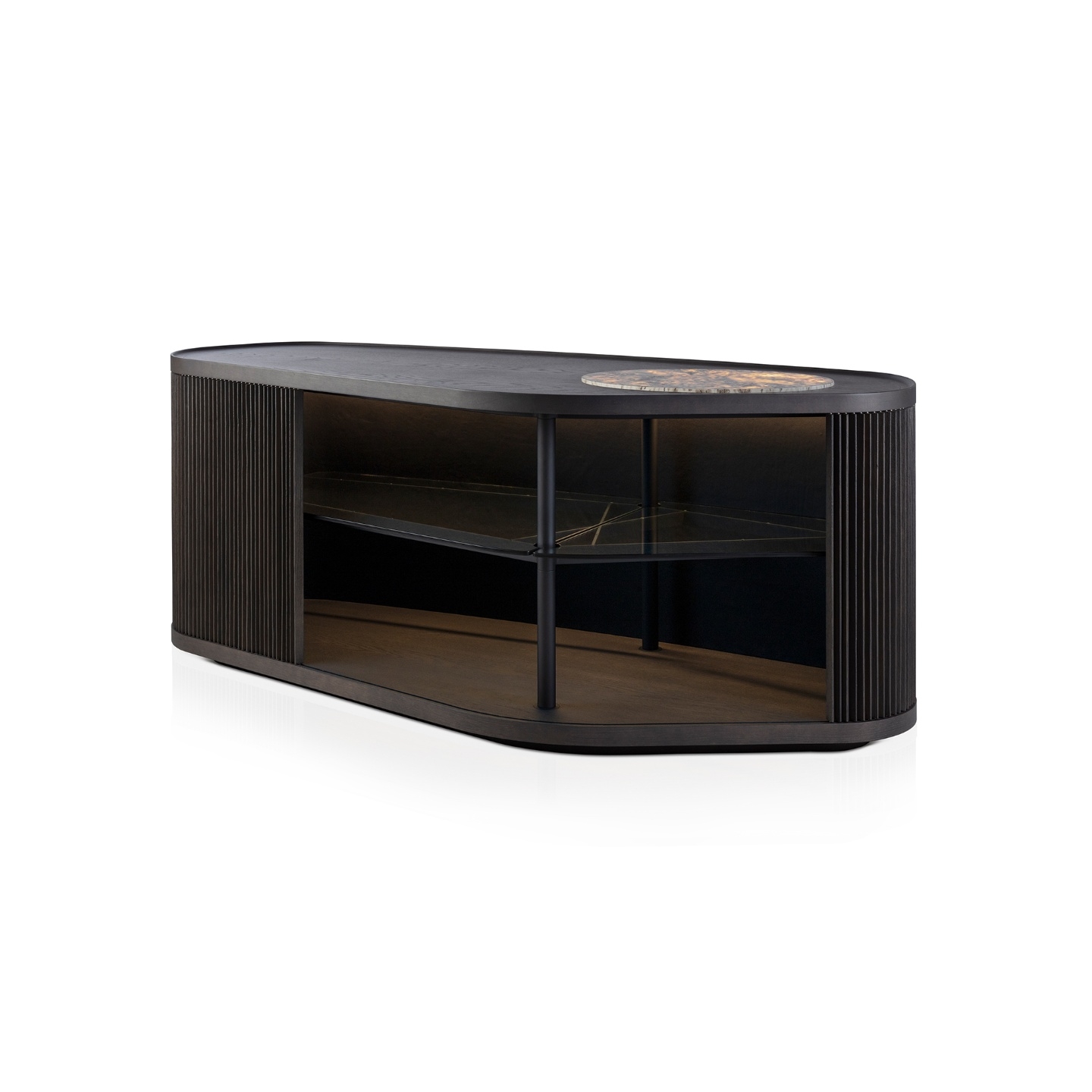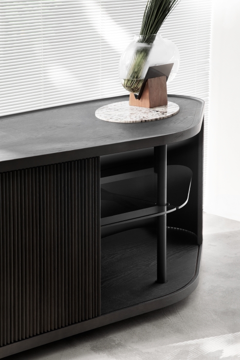 Portas: Madeira maciça, madeira maciça tingida Revestimento interno: Revestido em tecido ou couro Estrutura interna: Laca, aço carbono pintado Borda do tampo: Madeira maciça, madeira maciça tingida Prateleiras: Vidro Borda das prateleiras: Laca, aço carbono pintado Tampo e base: Lâmina natural, lâmina tingida
