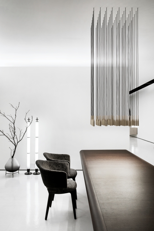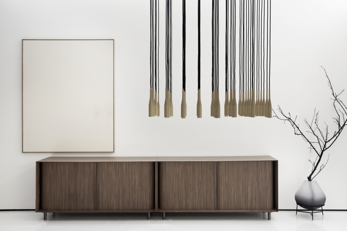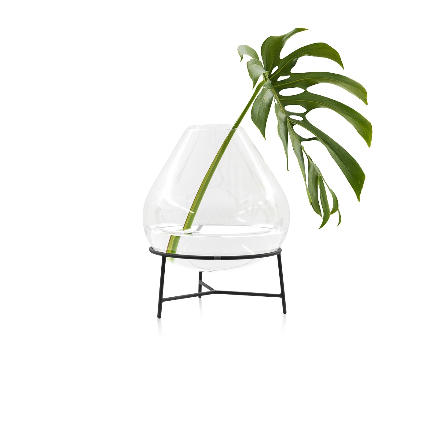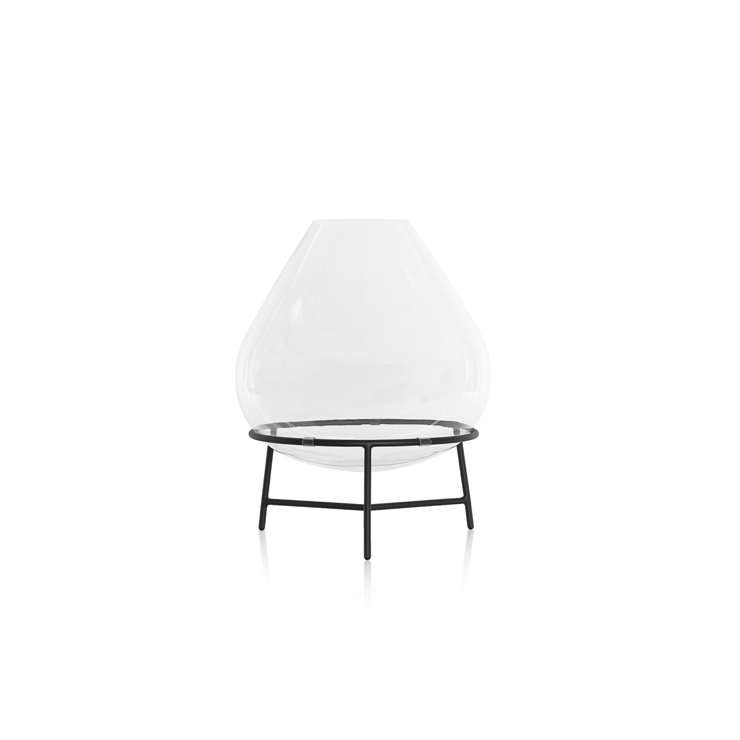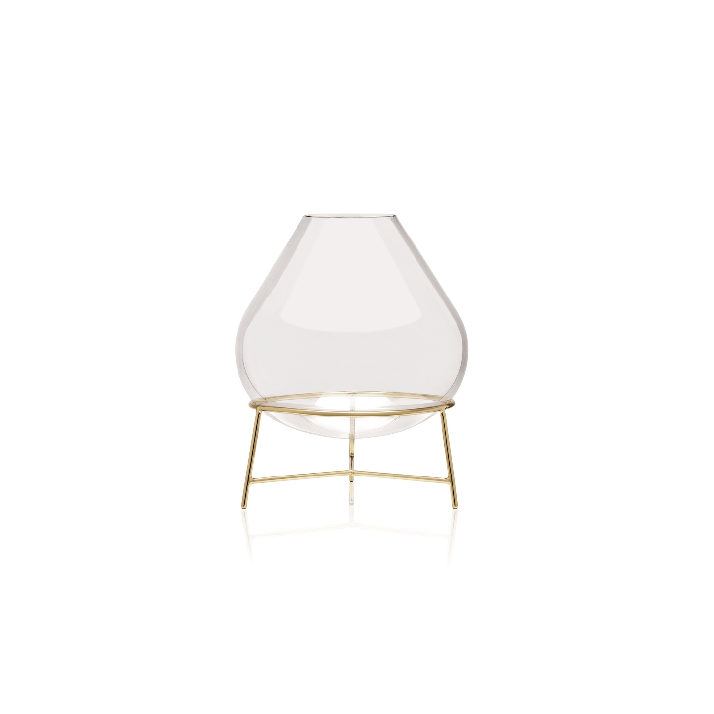 Cada peça é única, feita a mão onde as pequenas bolhas e as ligeiras alterações formam a característica orgânica que criam perspectivas diversas, a armação sustenta a cúpula de vidro soprado por uma argola tangente, criando uma estética ao mesmo tempo industrial e sofisticada.