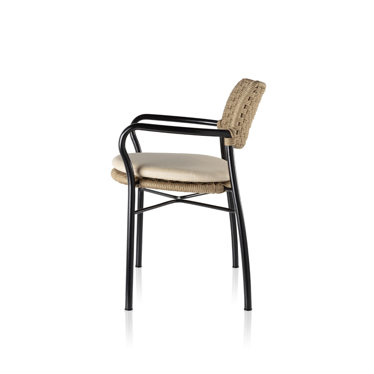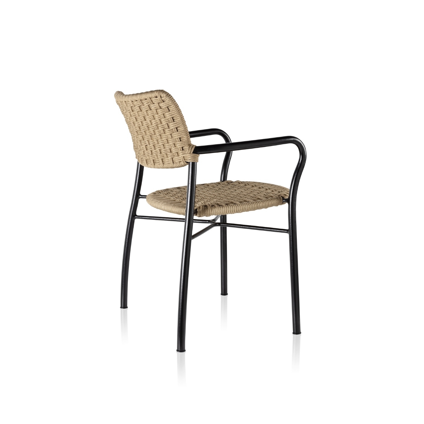 Estrutura: Metal, pintura eletroestática Braços: Metal, pintura eletroestática Assento e encosto: Corda náutica Assento superior: Estofado revestido em tecido