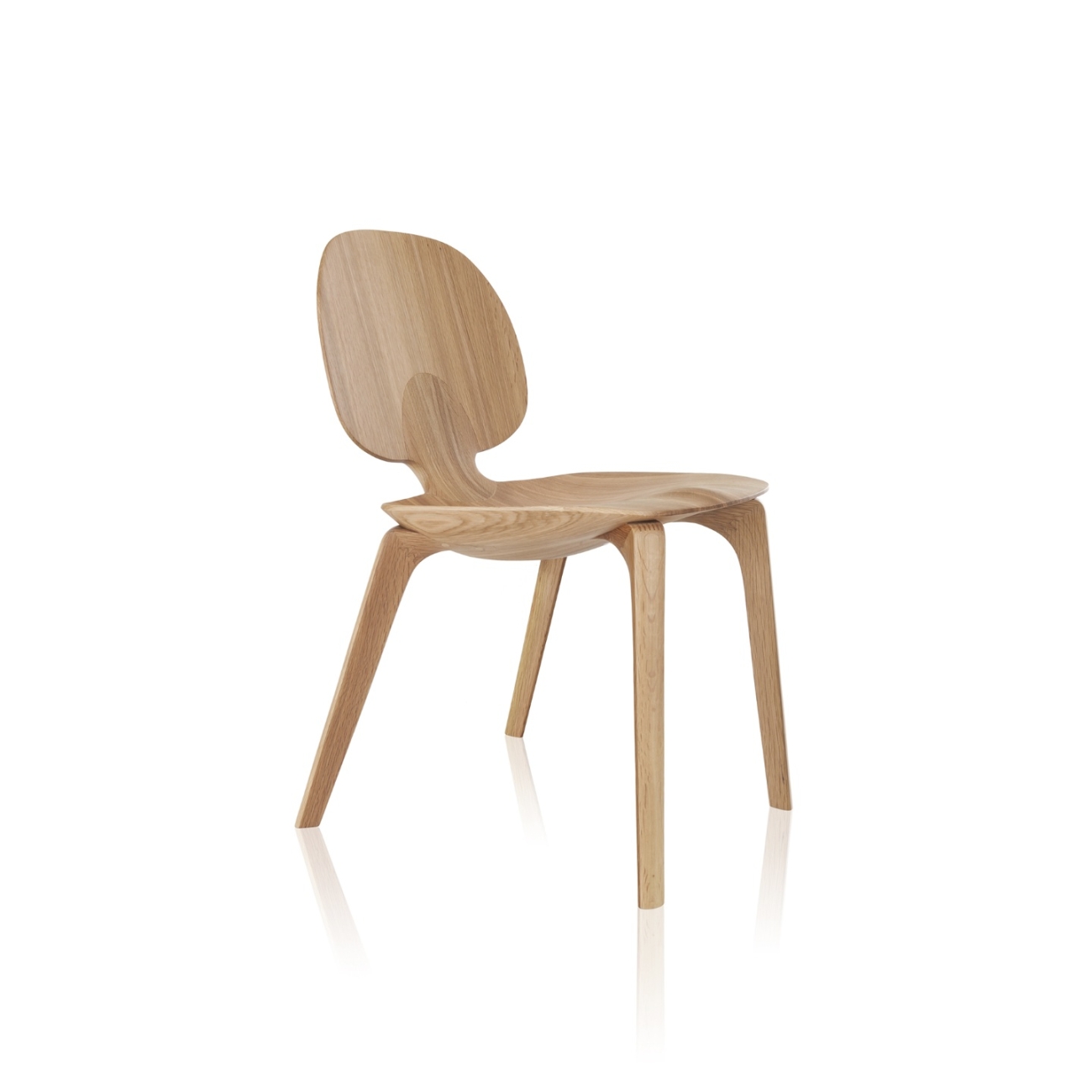 O desenho de traço fluido, inspirado na arte cicládica, confere leveza e delicadeza a cadeira. As formas anatômicas apoiam o tronco em sua totalidade enquanto as torções e arestas chanfradas parecem transpor o limite da resistência da madeira.