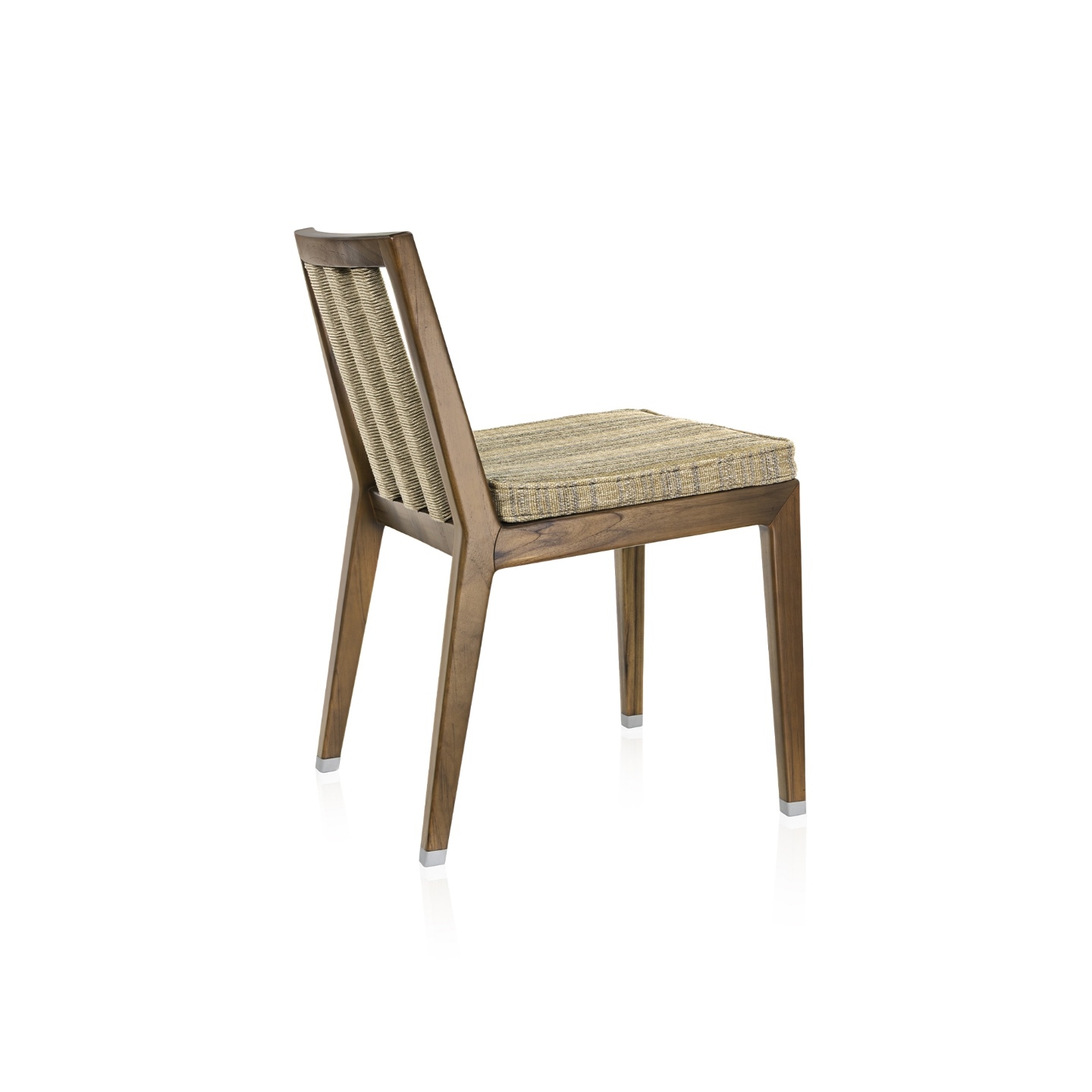 Estrutura: Madeira maciça, madeira maciça tingida Assento: Estofado revestido em tecido Ponteira: Metal Encosto: Madeira maciça, madeira maciça tingida, corda