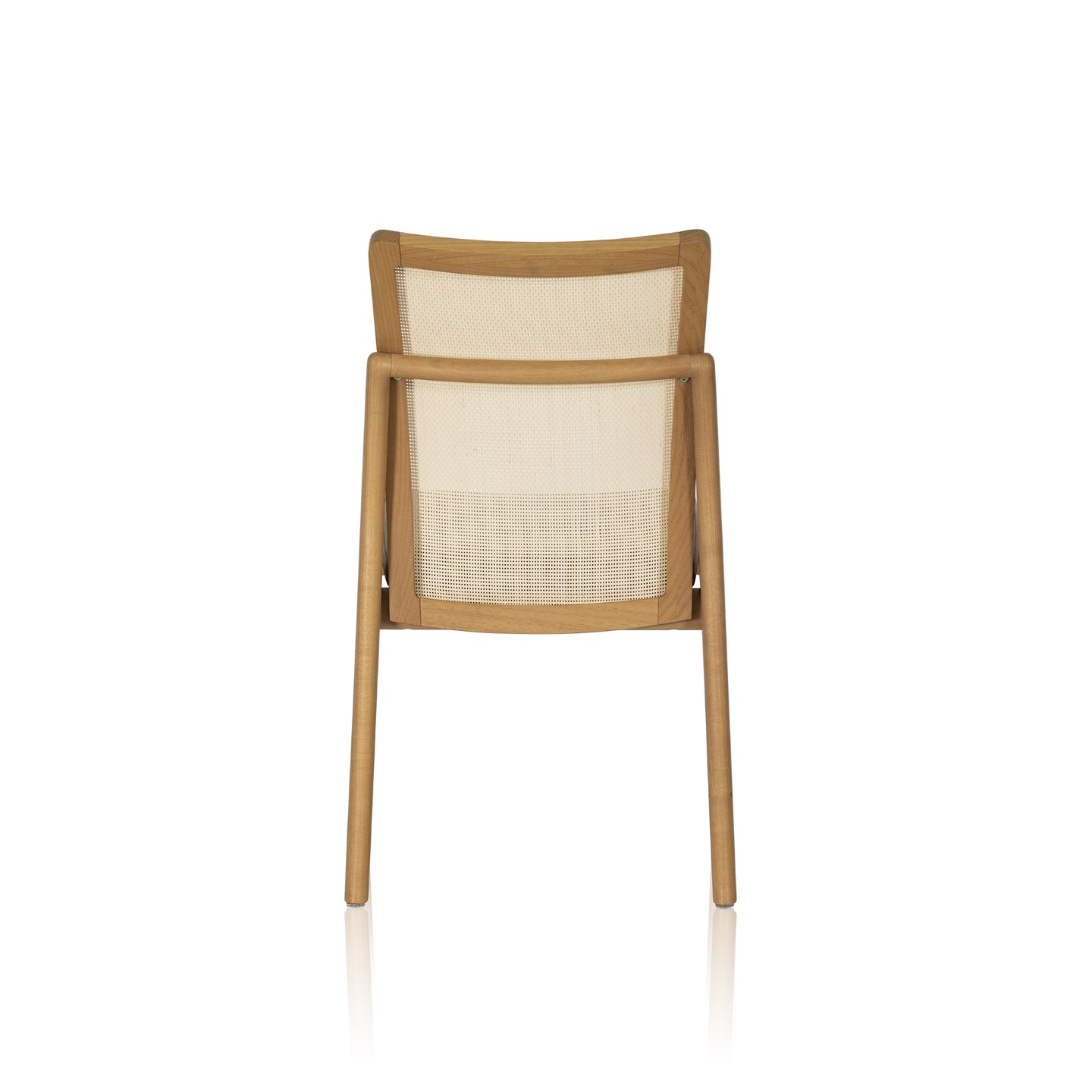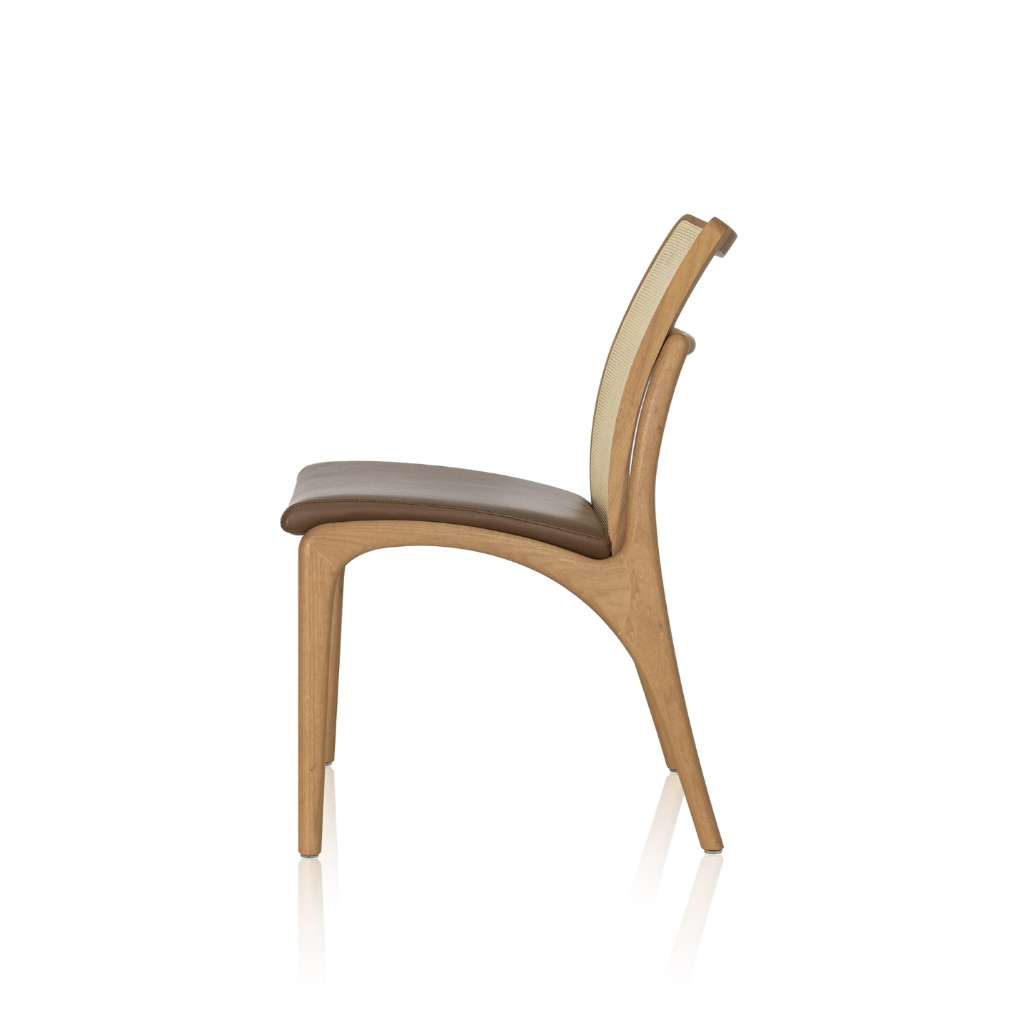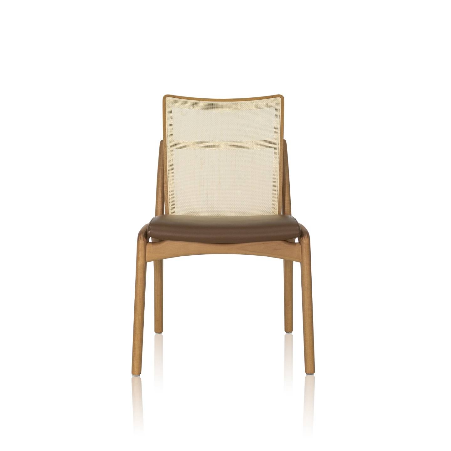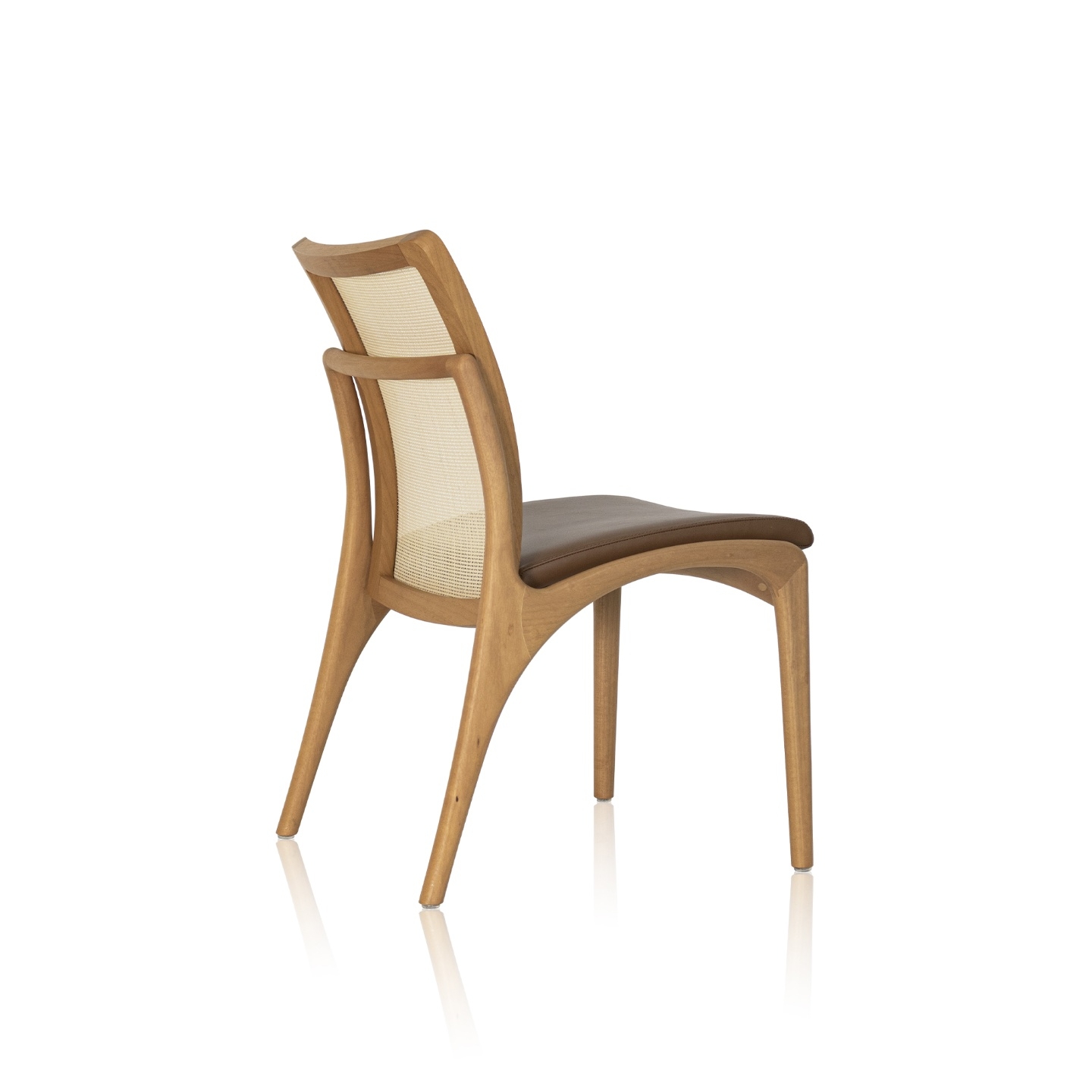 Estrutura: Madeira maciça, madeira maciça tingida Assento: Estofado revestido em tecido ou couro Encosto: Palha de rattan, palha de algodão