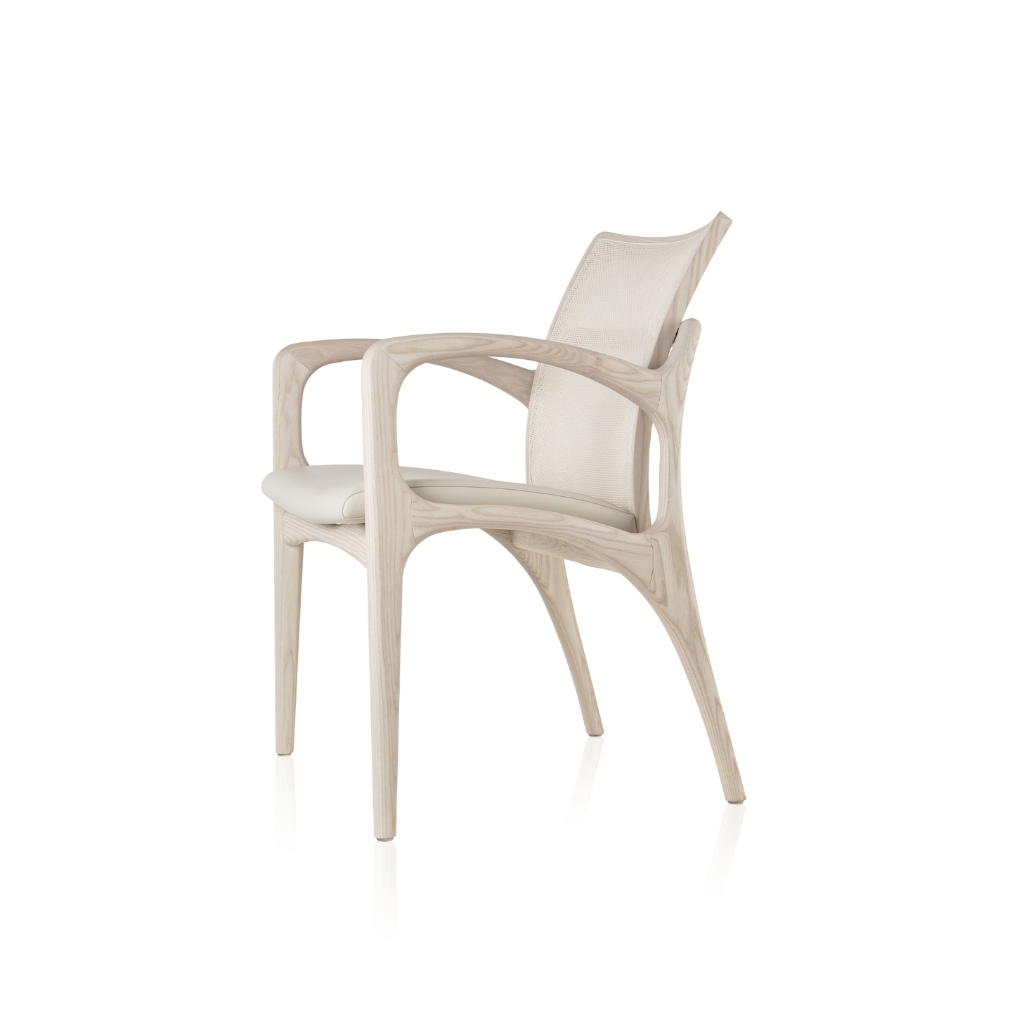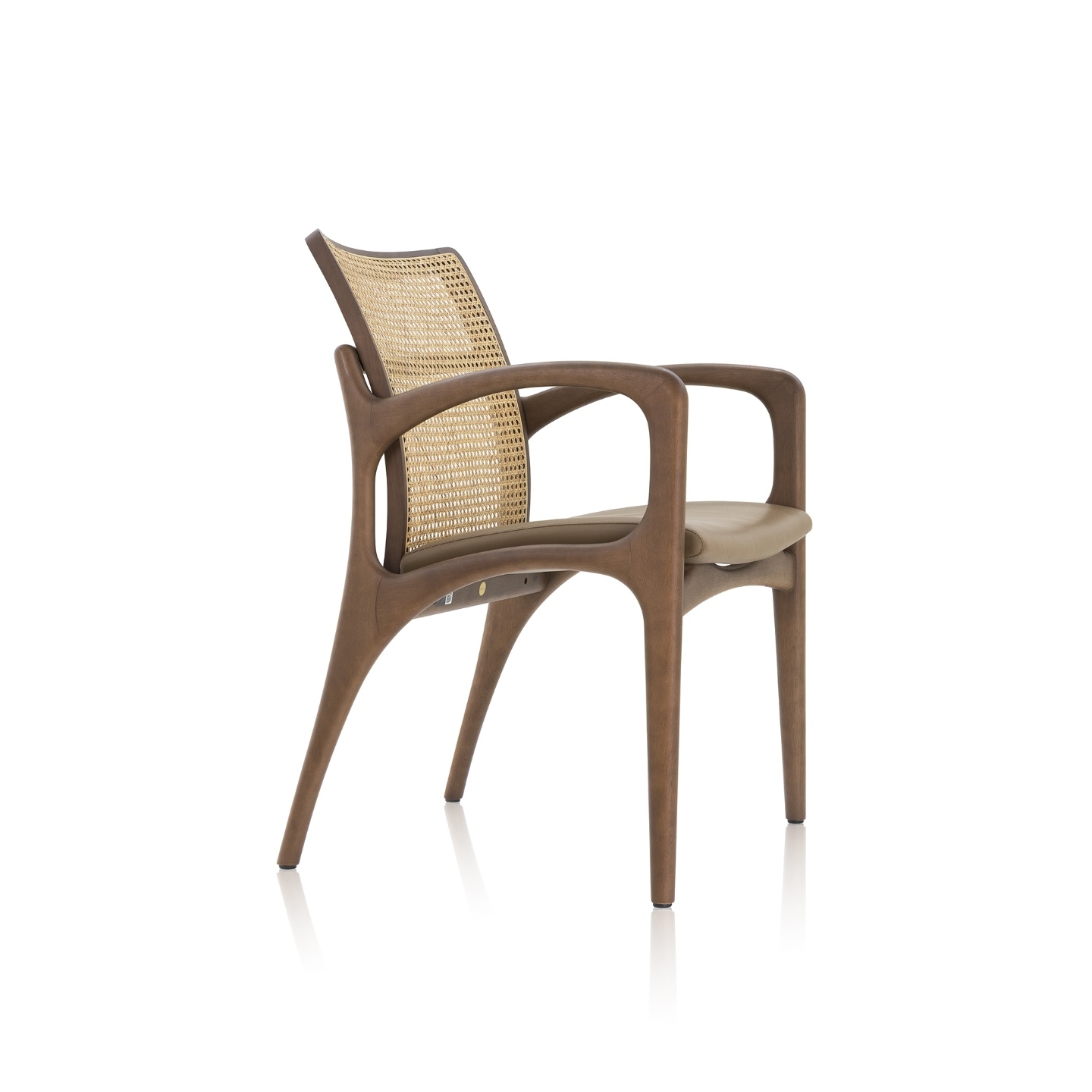 Estrutura: Madeira maciça, madeira maciça tingida Braços: Madeira maciça, madeira maciça tingida Assento: Estofado revestido em tecido ou couro Encosto: Palha de rattan, palha de algodão
