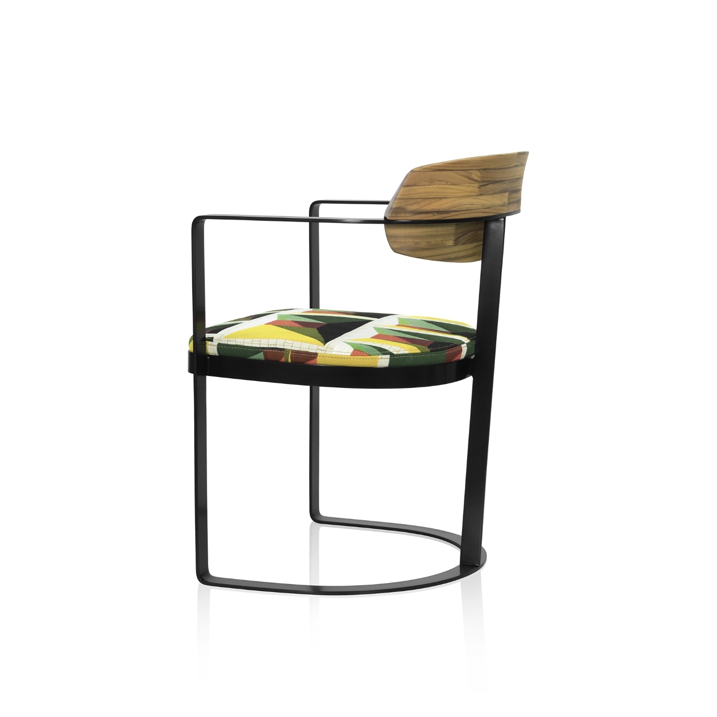 Estrutura: Metal, pintura eletroestática Encosto: Madeira maciça, madeira maciça tingida Assento: Corda náutica, estofado revestido em tecido