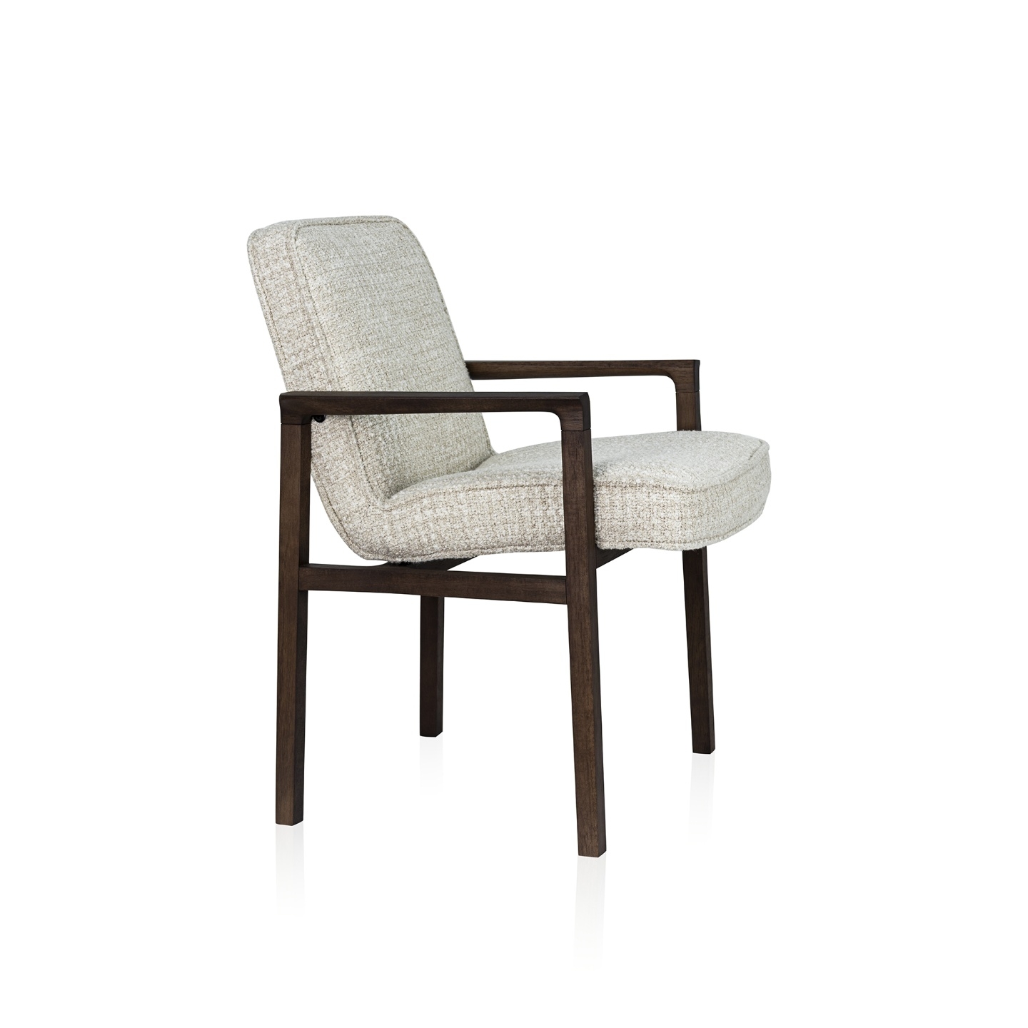 A cadeira Gio é uma peça amistosa com detalhes sutis e bem resolvidos. Os braços são levemente chanfrados e arredondados enquanto o assento e o encosto estofados parecem flutuar na estrutura de madeira.