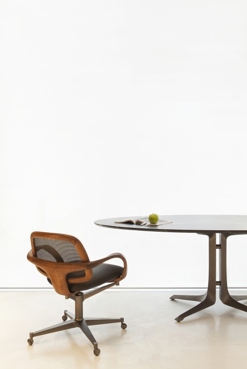 A linha Mia possui sutileza e fluidez, percebida por meio do ponderado equilíbrio de escala, proporções e linhas, além das torções e arestas chanfradas, que parecem transpor o limite da resistência da madeira.