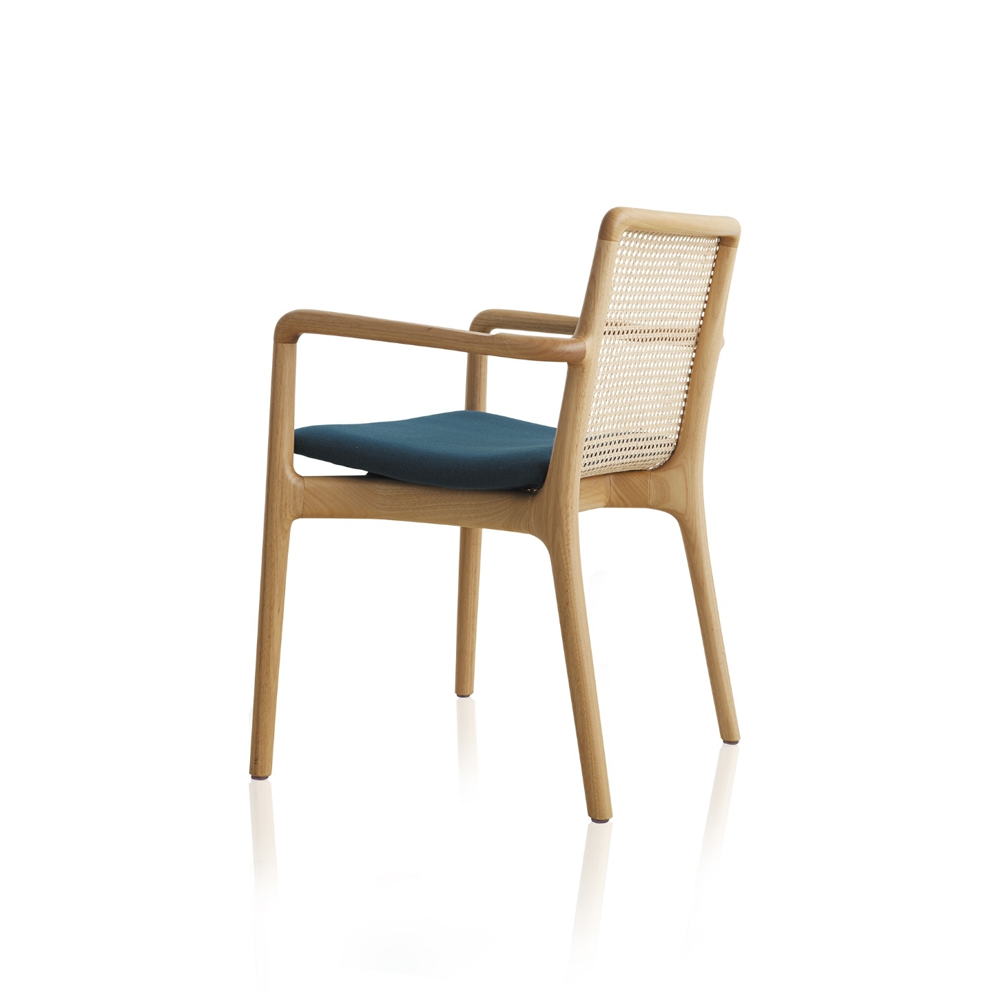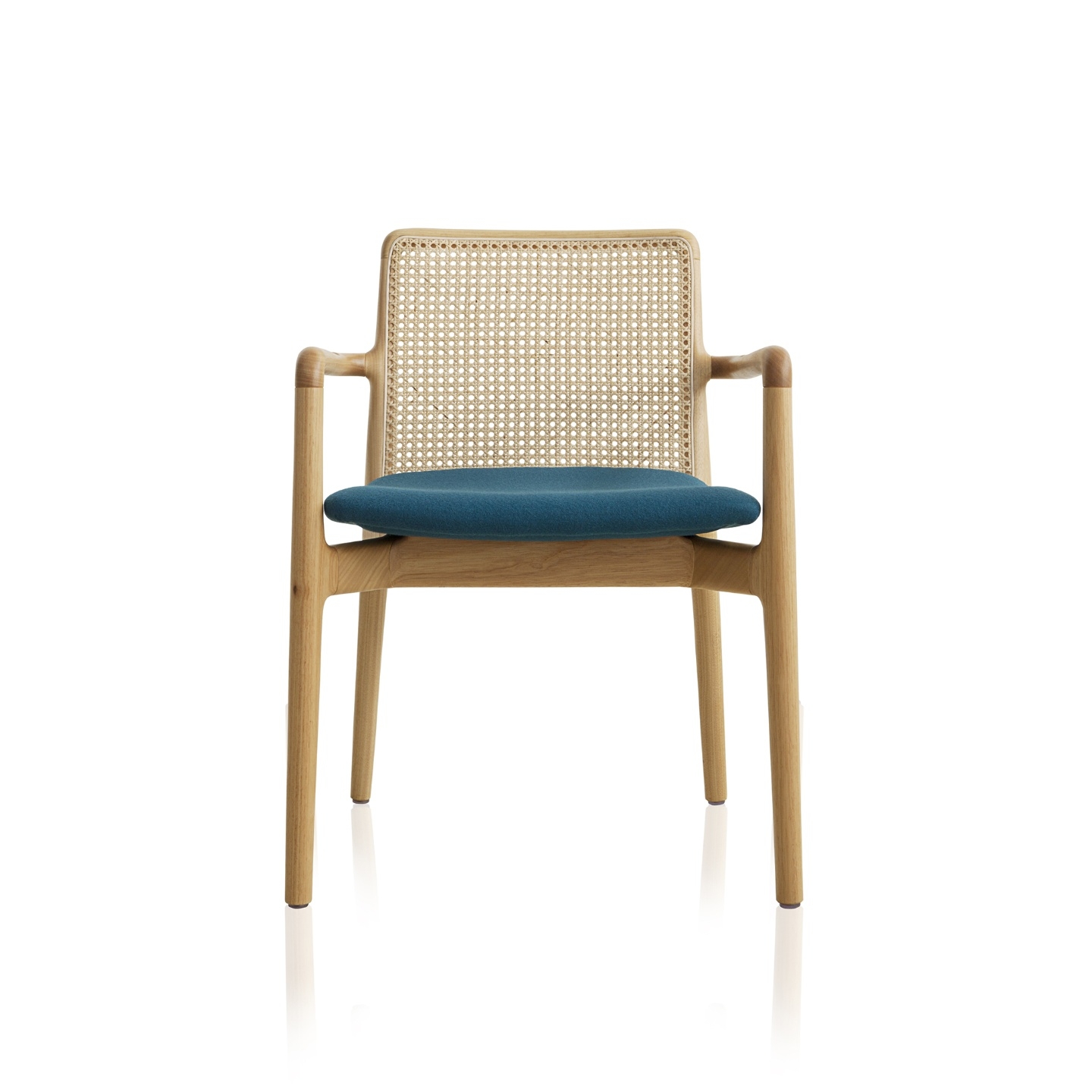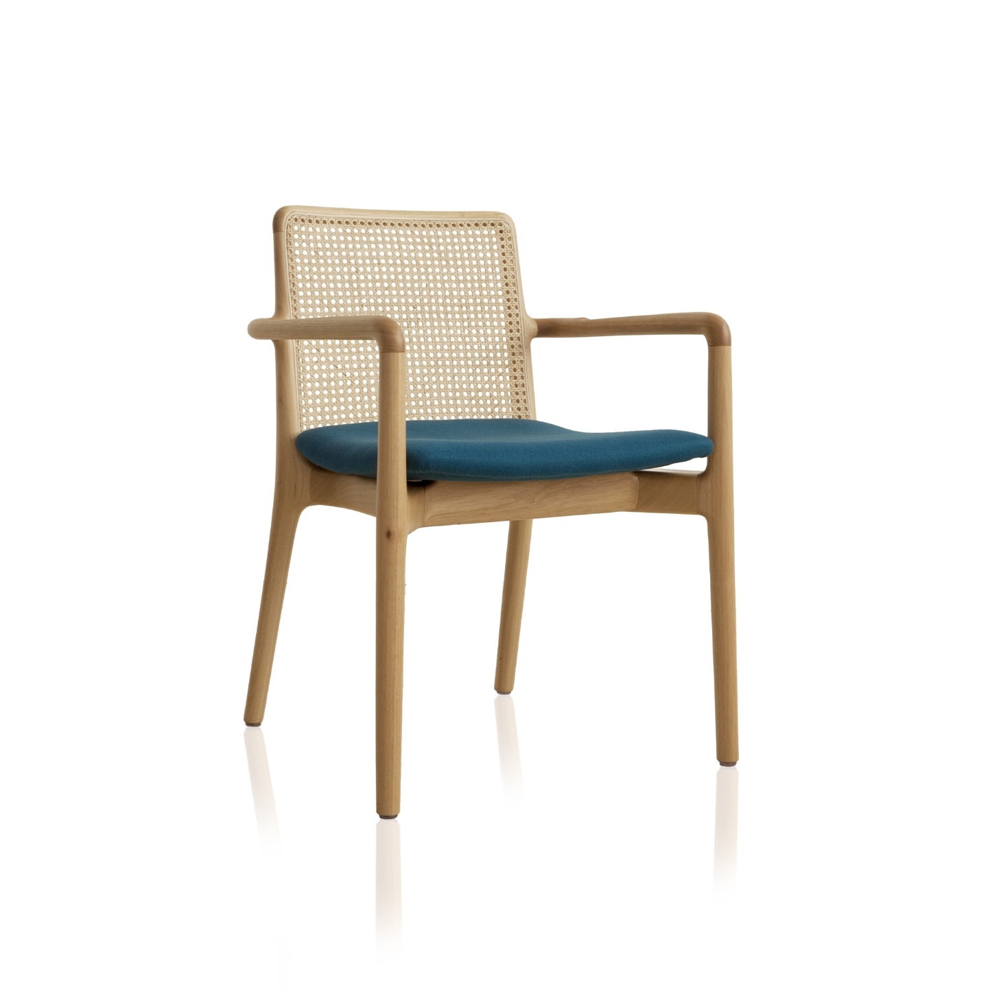 Estrutura: Madeira maciça, madeira maciça tingida Braços: Madeira maciça, madeira maciça tingida Assento: Estofado revestido em tecido ou couro Encosto: Palha de rattan