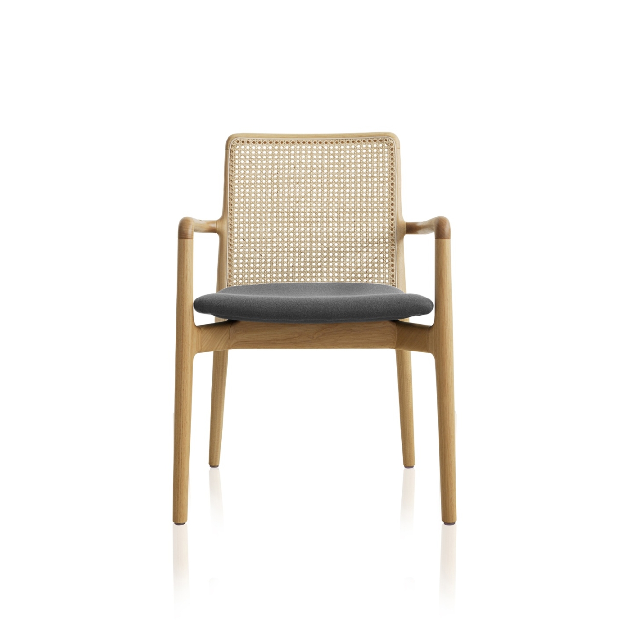 Estrutura: Madeira maciça, madeira maciça tingida Braços: Madeira maciça, madeira maciça tingida Assento: Estofado revestido em tecido ou couro Encosto: Palha de rattan