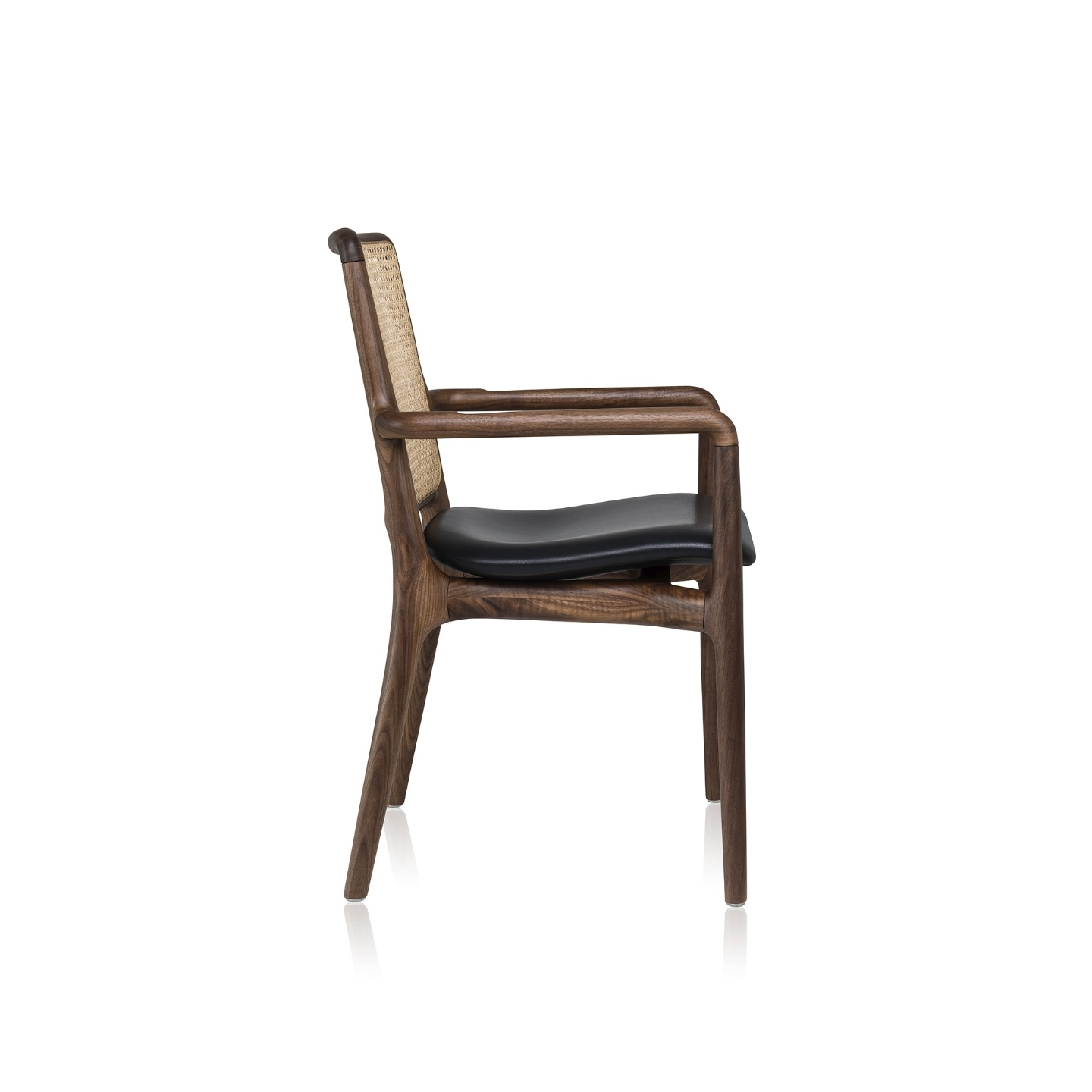 Estrutura: Madeira maciça, madeira maciça tingida Braços: Madeira maciça, madeira maciça tingida Assento: Estofado revestido em tecido ou couro Encosto: Palha de rattan