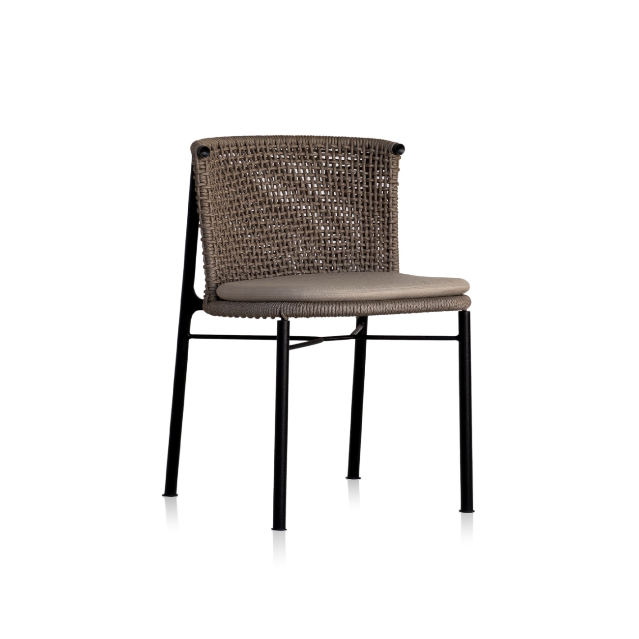 Estrutura: Metal, pintura eletroestática Assento e encosto: Corda náutica Assento superior: Estofado revestido em tecido