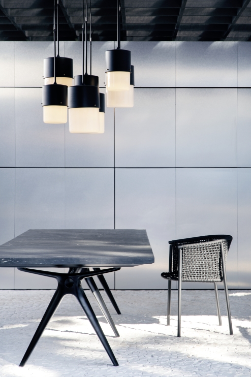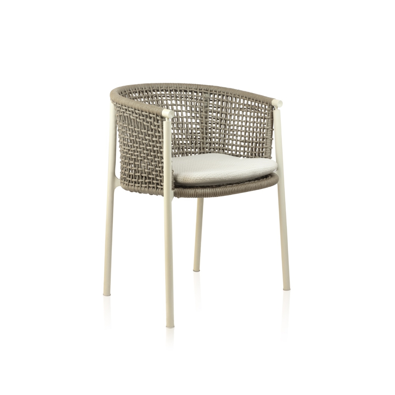 Estrutura: Metal, pintura eletroestática Assento e encosto: Corda náutica Braços: Corda náutica Assento superior: Estofado revestido em tecido