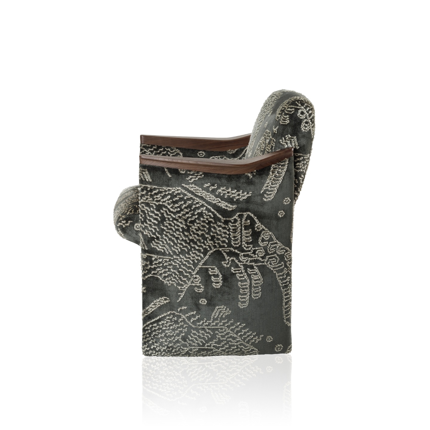 Estrutura: Estofado revestido em tecido Braços: Madeira maciça, madeira maciça tingida