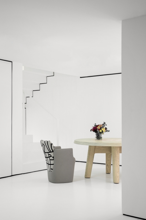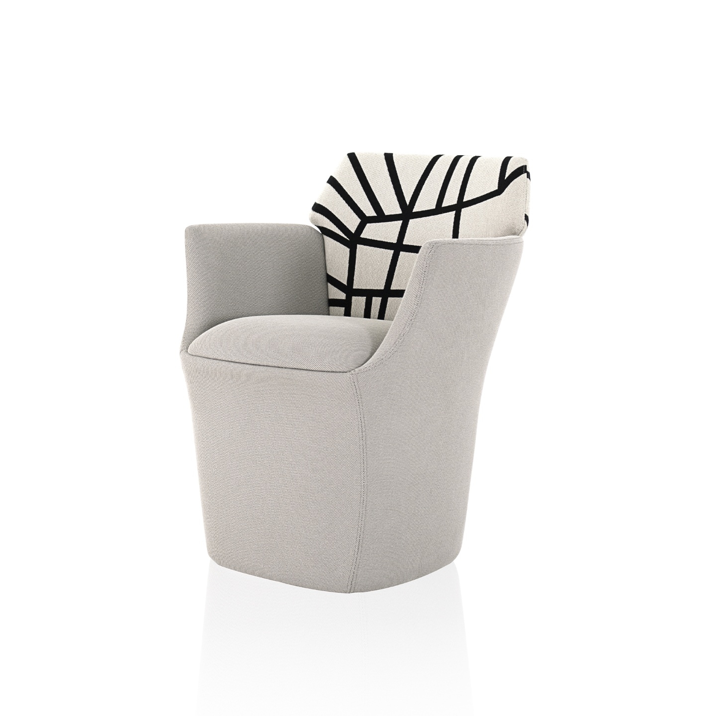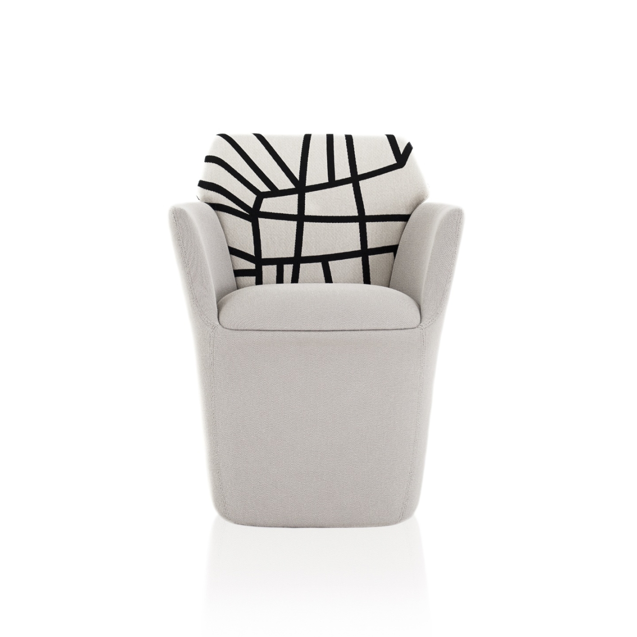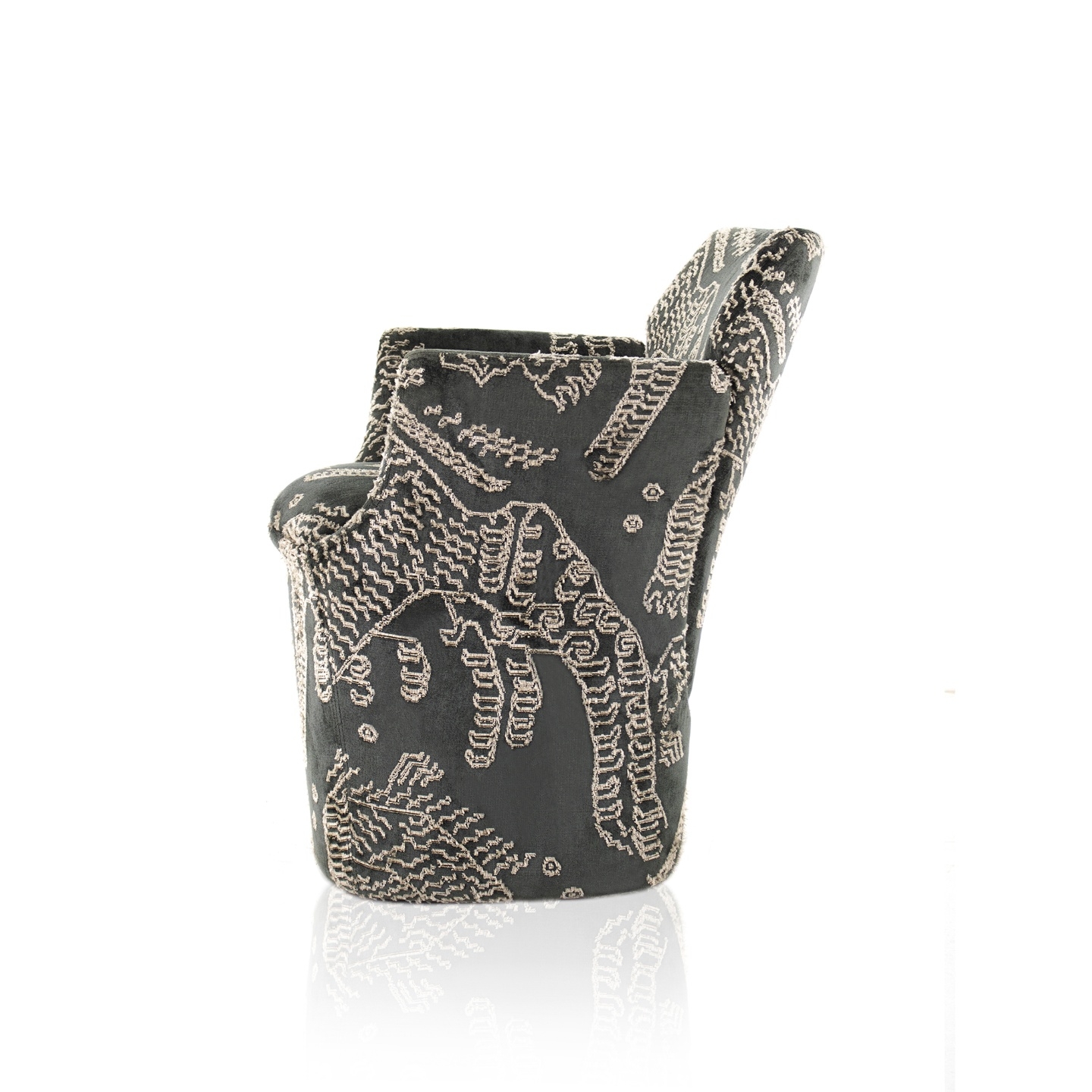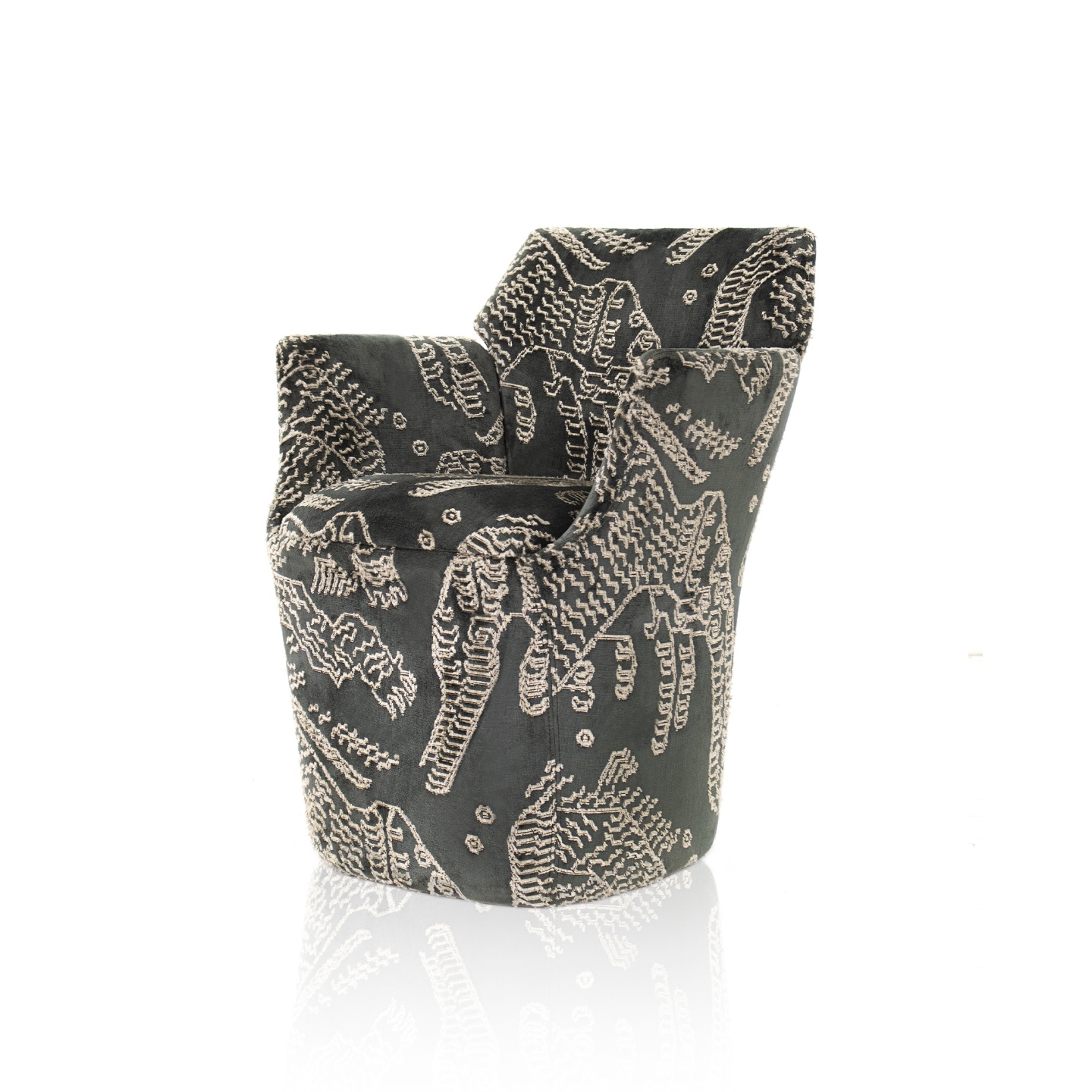 Mesmo sendo completamente estofada, a cadeira SUITE é esbelta, com curvas bem delineadas e desenho rico em detalhes. As costuras e tecidos estruturados, são aplicados como em vestidos de alta alfaiataria, e fazem com que tanto frente quanto o verso sejam valorizados e igual maneira.