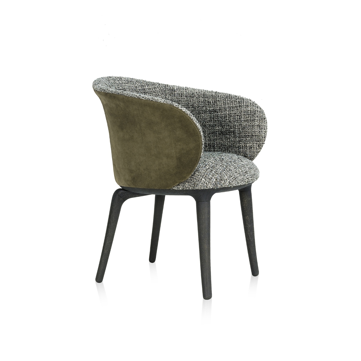 Pés: Madeira maciça, laca, madeira maciça tingida Assento e encosto: Estofado revestido em tecido ou couro Braços: Estofado revestido em tecido ou couro