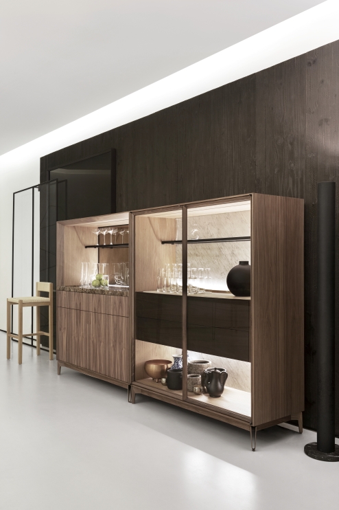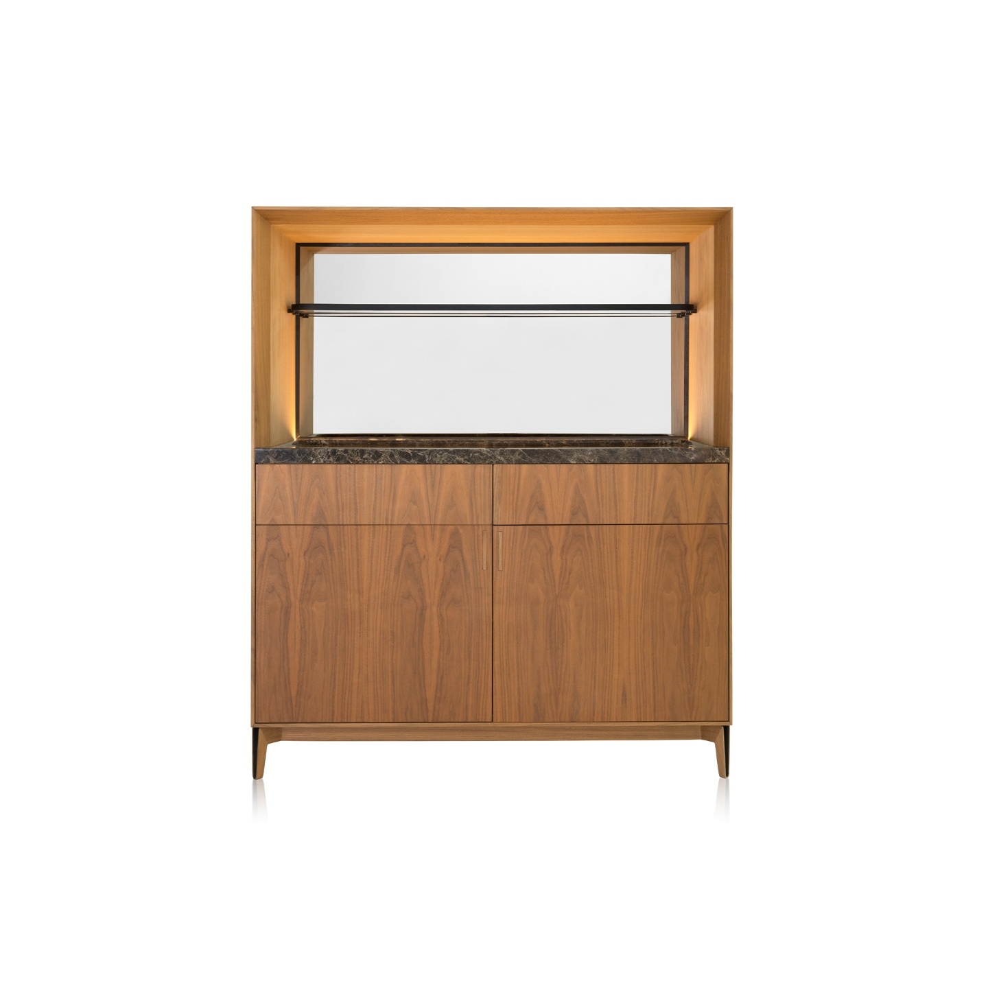 Estrutura: Lâmina natural, lâmina tingida Revestimento interno: Espelho Gaveta: Lâmina natural, lâmina tingida Prateleiras: Vidro Borda das prateleiras: Metal Portas: Vidro Tampo: Mármore Revestimento interno gavetas: Couro
