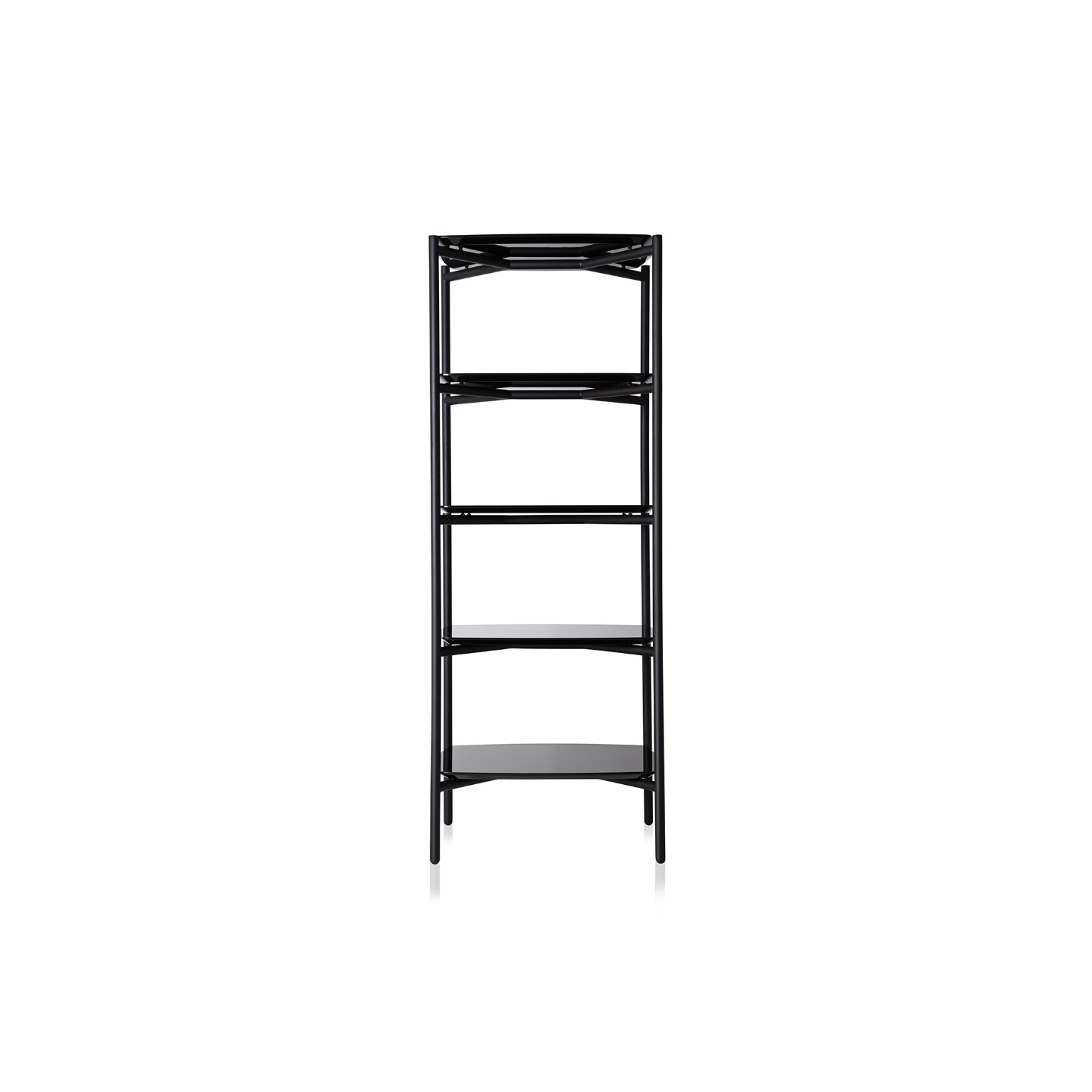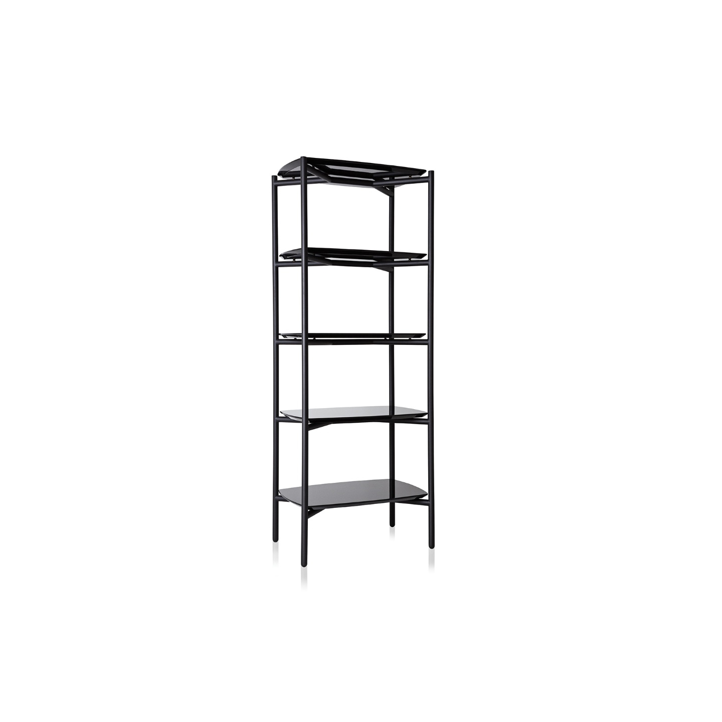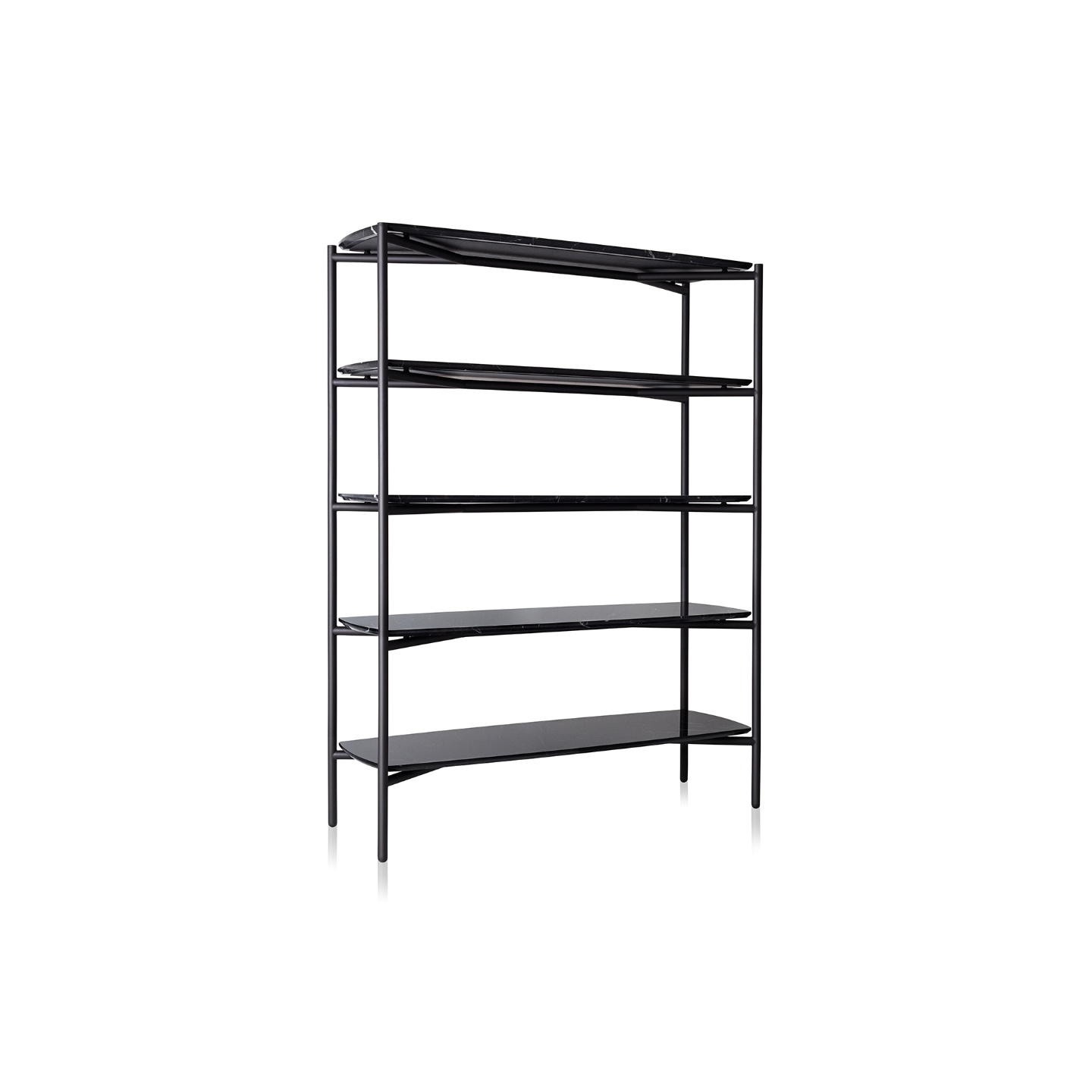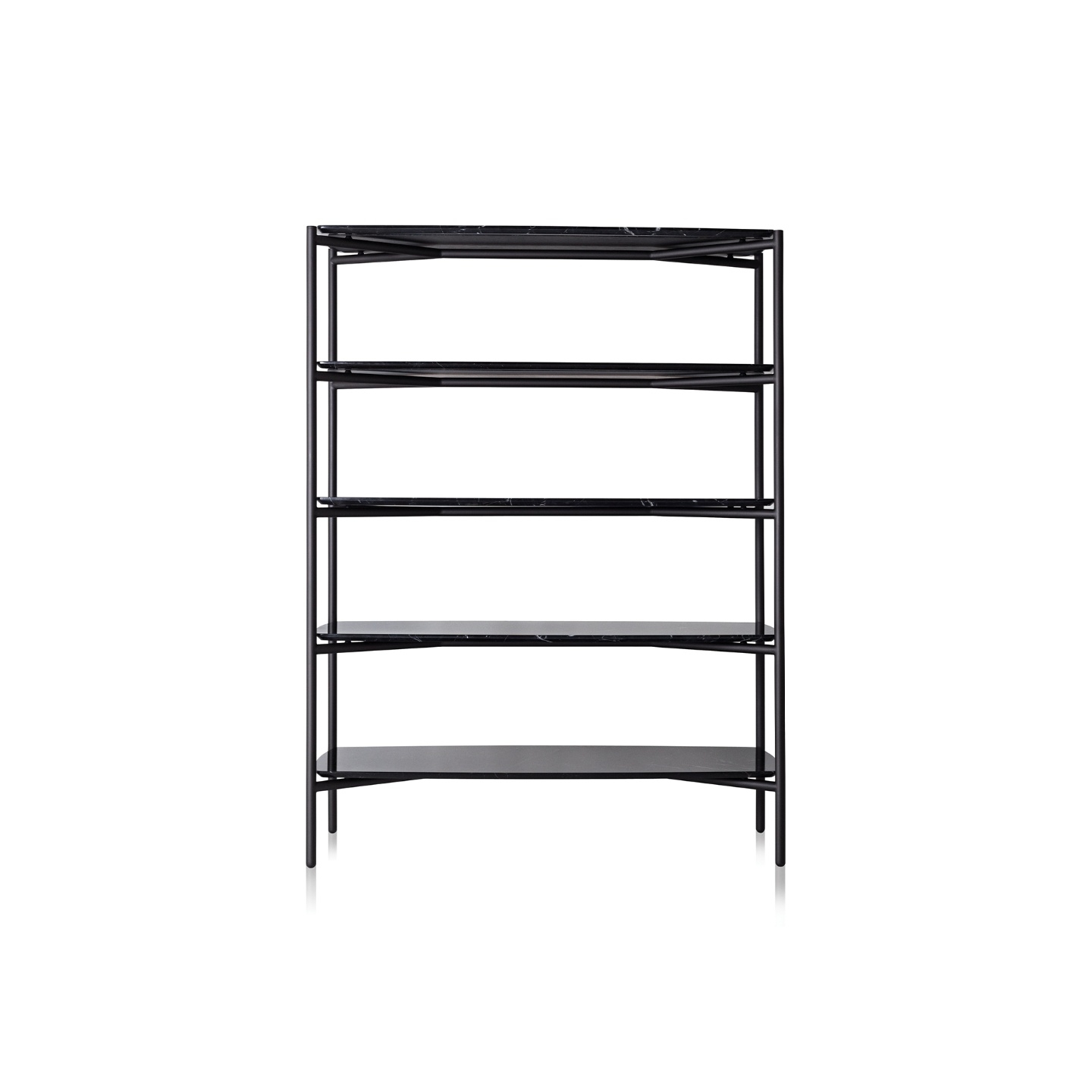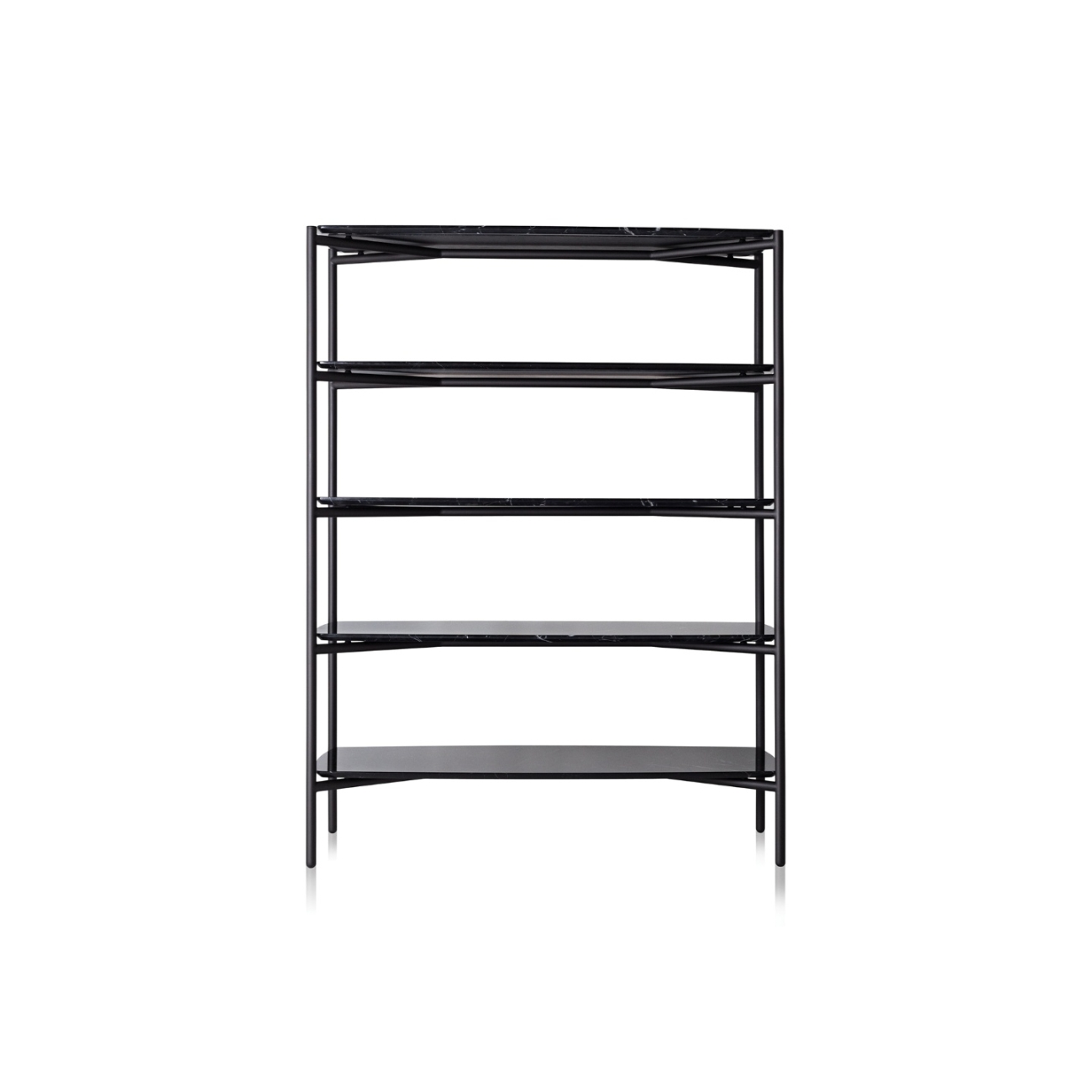 A armação metálica sustenta as prateleiras que podem ser de mármore ou madeira, criando uma estética limpa, elegante e atemporal. A peça integra o ambiente com a sutileza e sofisticação.