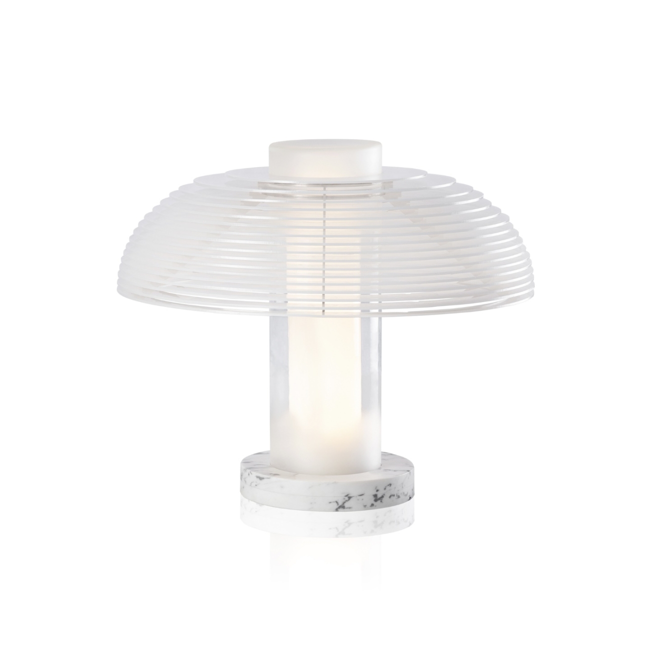 Um corpo clássico formado por um apoio central e cúpula semiesférica tem a lógica da luz subvertida. A fonte luminosa não parte de dentro da cúpula, mas sim, de um cilindro leitoso dentro de outro cilindro semitransparente que forma o eixo central. O resultado é mágico.