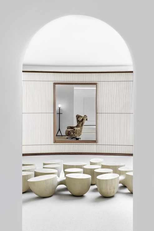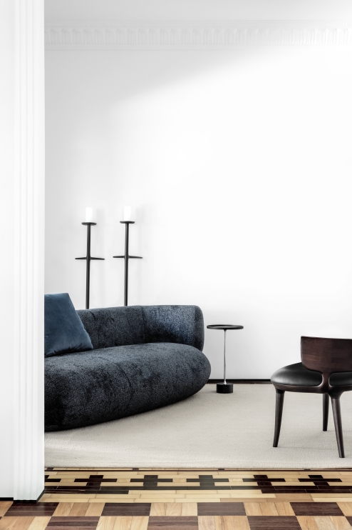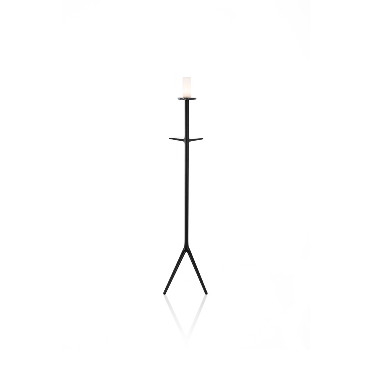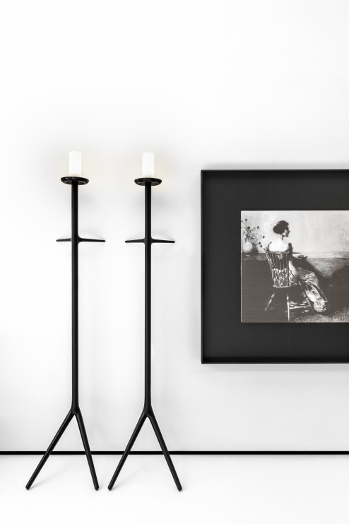 Produtos que compõem a coleção PLATTE possuem como característica em comum, a base da cúpula em mármore esculpido – que remete a forma de um prato - e cilindros de vidro leitoso, que difundem a luz de maneira delicada e homogênea. A luminária PLATTE de chão extrapola os paradigmas da função técnica de iluminar e apresenta-se como um objeto também escultórico.