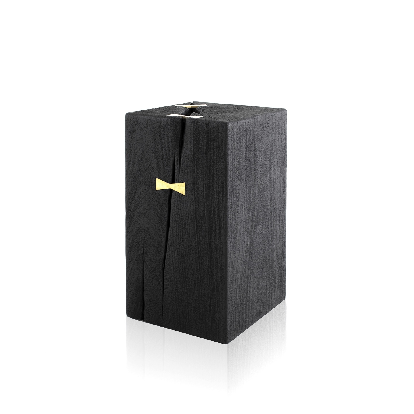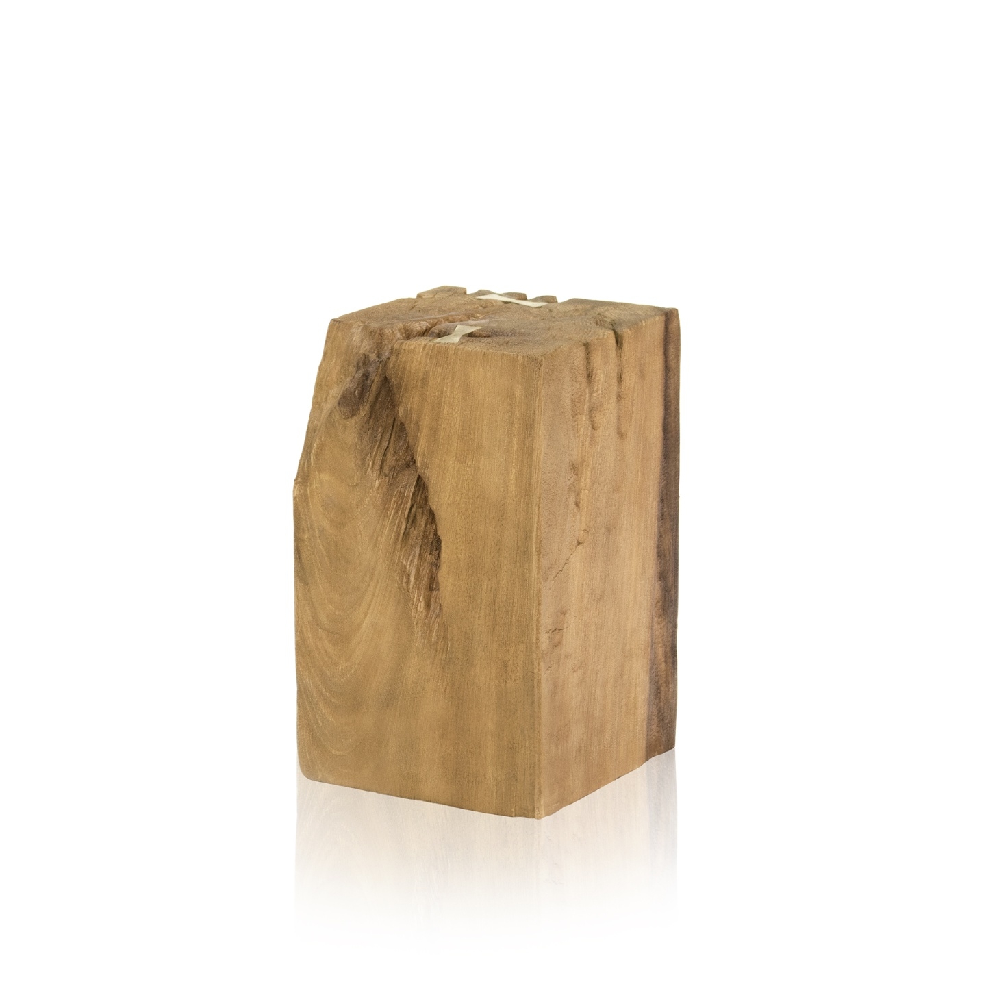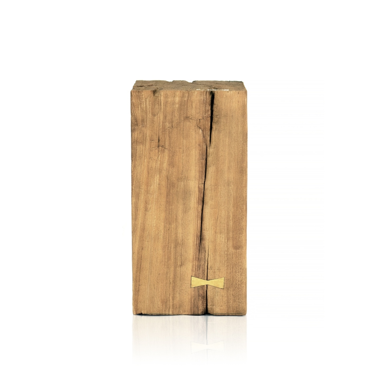 Essa é uma das peças da coleção que pode ser definida pela expressão “one of a kind”, ou seja, única, singular. A peça em madeira escolhida passa por poucos processos fabris, apenas para estabilização do material e para manter superfícies retilíneas. Os veios, fissuras e rachaduras são mantidos e valorizados, além de receberem a incrustação de uma peça em latão para conferir resistência e elegância.