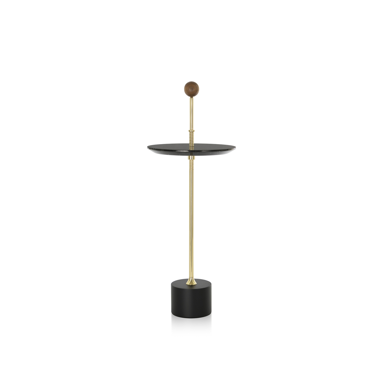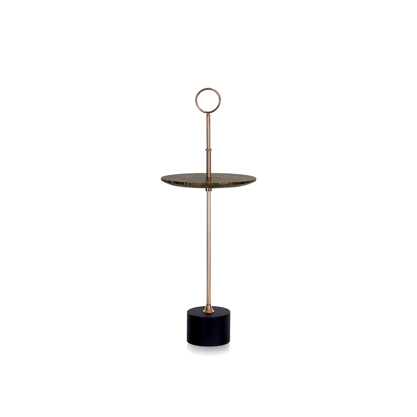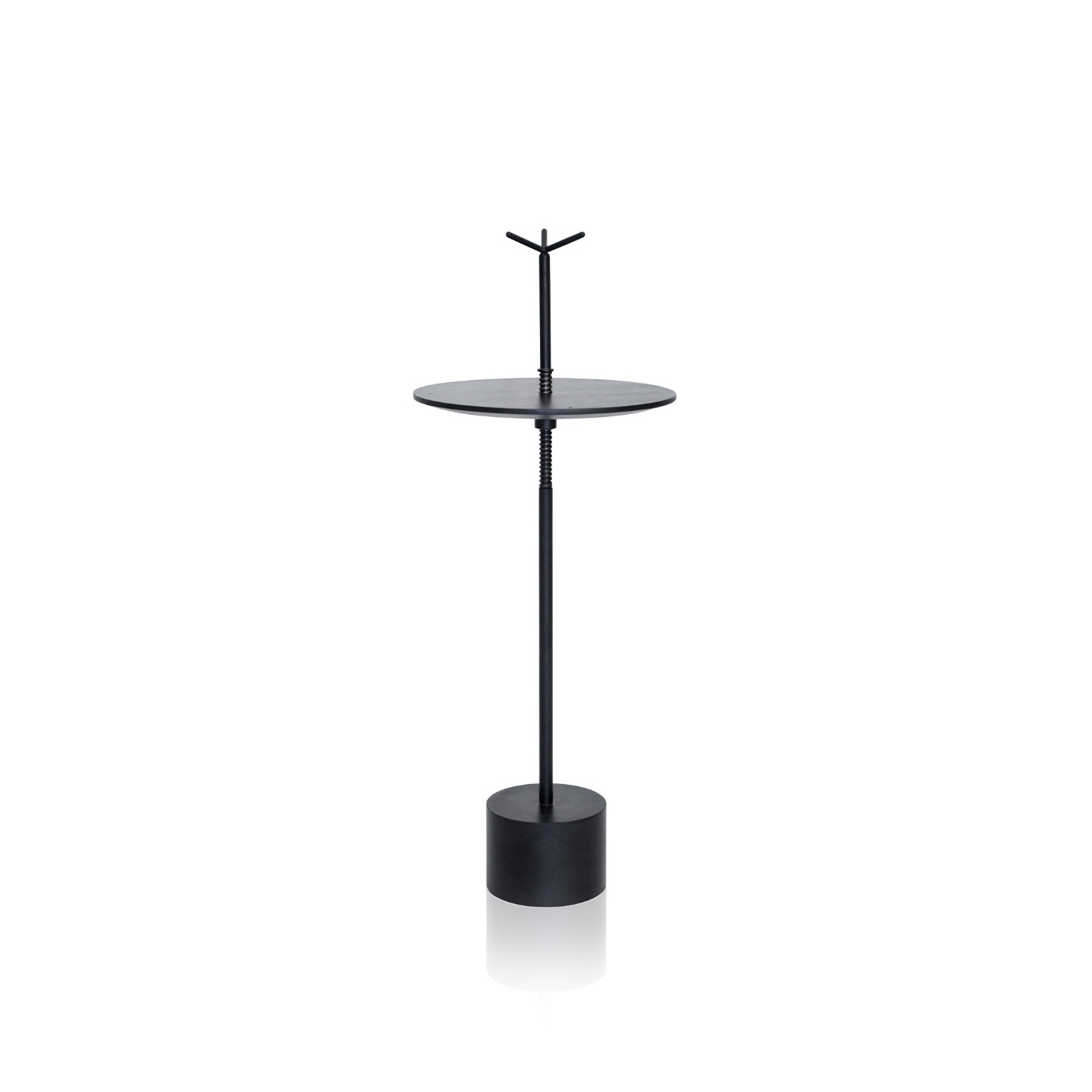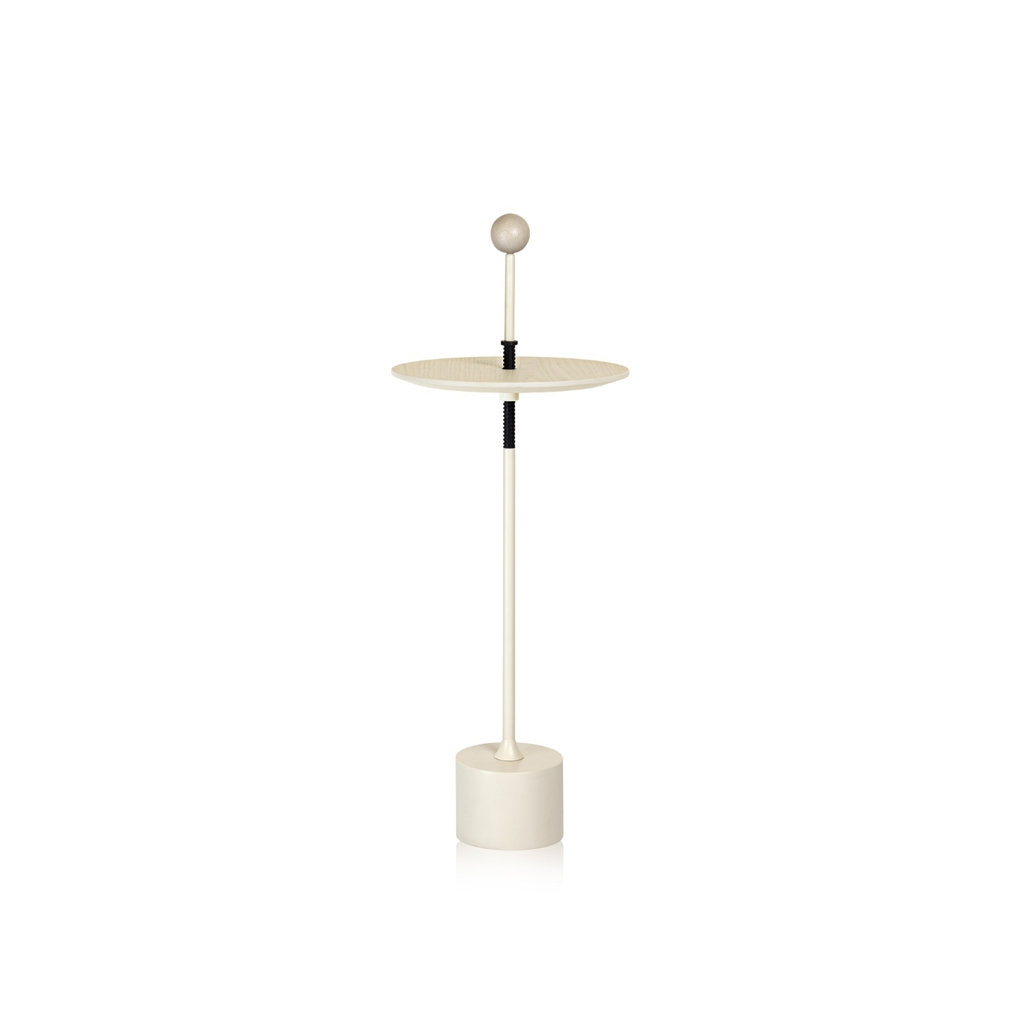 As mesas laterais Cigg possuem design leve e funcional. Enquanto o fuso orienta a altura do tampo redondo, os pegadores em forma de bola, argola ou tripé invertido permitem praticidade na mobilidade da peça pelo ambiente.
