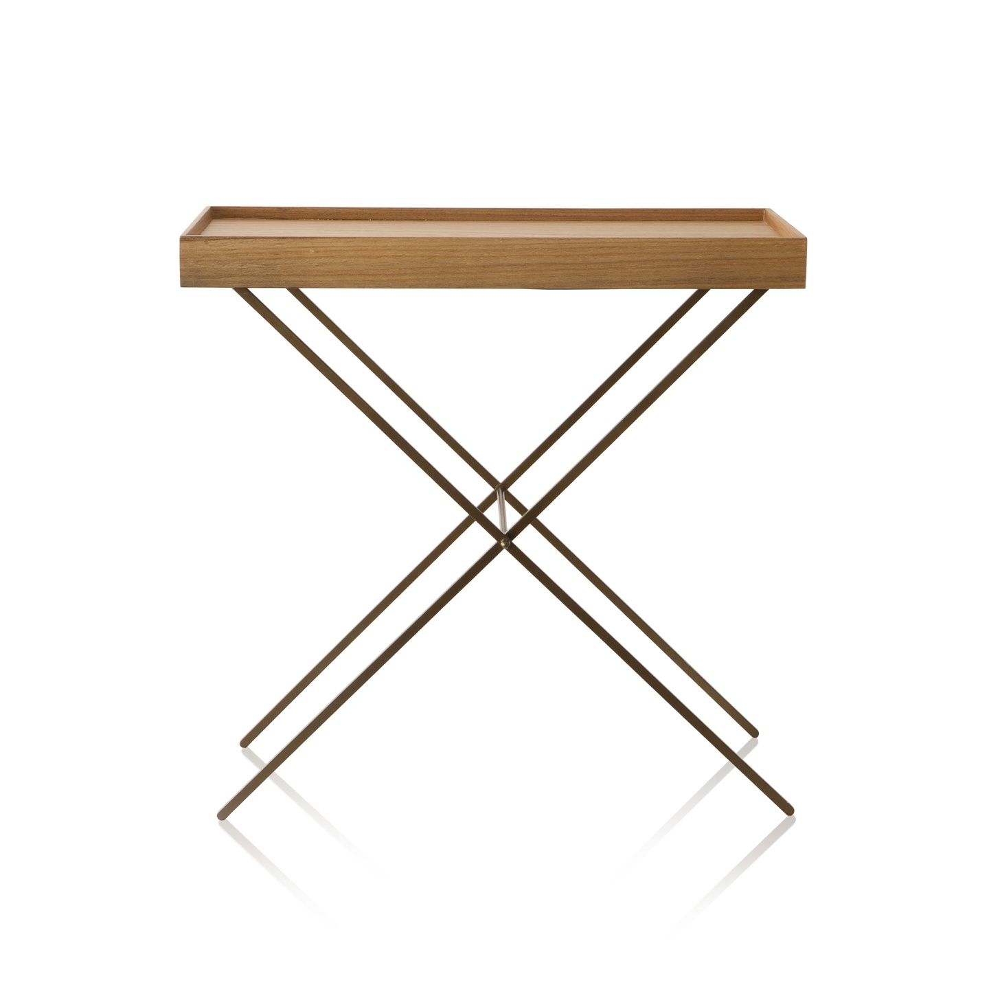A mesa é caracterizada pela leveza visual e pureza de seu aspecto formal. Sua funcionalidade é incrementada pelo ajuste de altura da fina estrutura metálica em perfil quadrado e pela superfície em madeira com bordas pronunciadas.