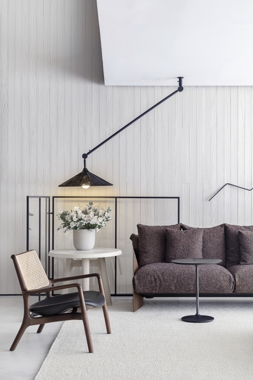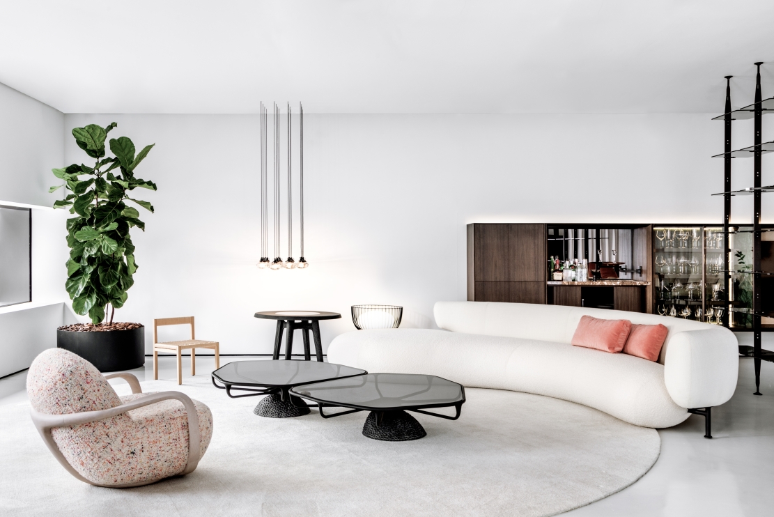 A rigidez geométrica, as espessuras generosas e o tampo em materiais distintos caracterizam a família de produtos SAINT. Sua estrutura parte de uma matriz de linhas puristas, com pés em construção em travas superiores, que servem de solução construtiva para suportar diferentes formatos, sem prejudicar a integridade estrutural ou a forma. O centro em mármore pode ser giratório para facilitar o serviço.