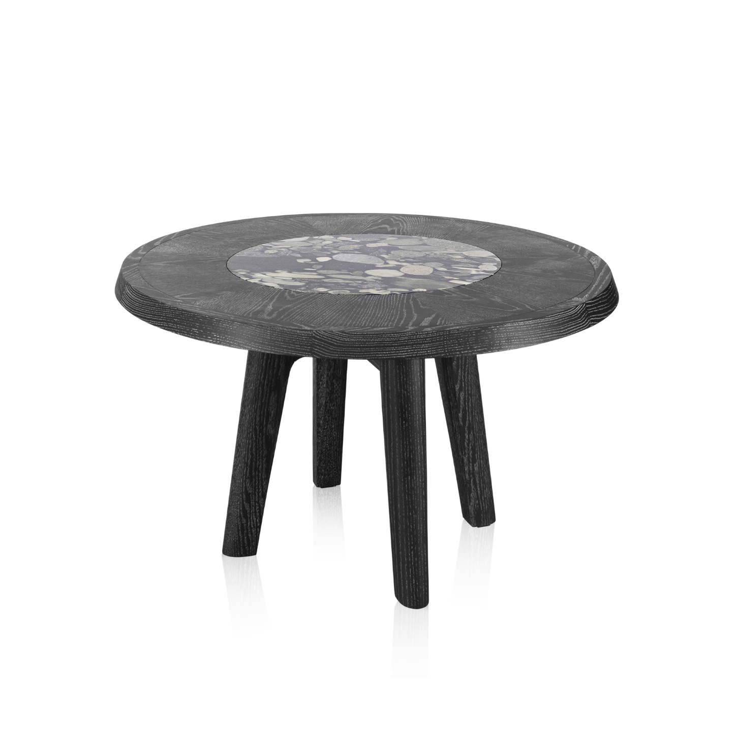 Tampo: Lâmina natural, lâmina tingida Centro do tampo: Mármore Base: Madeira maciça, madeira maciça tingida