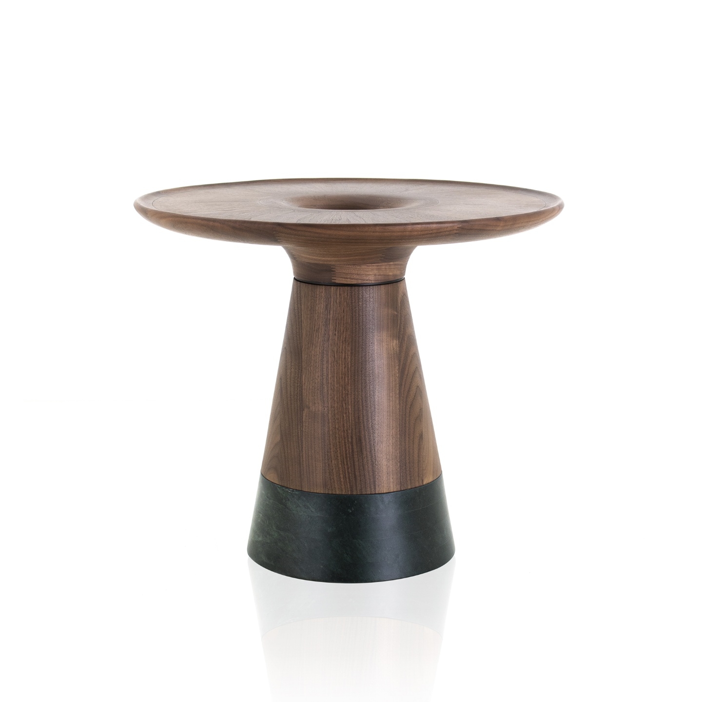 Estrutura: Madeira maciça Tampo: Lâmina natural, lâmina tingida Borda do tampo: Madeira maciça Base: Madeira maciça, mármore Centro do tampo: Espelho Anel: Metal