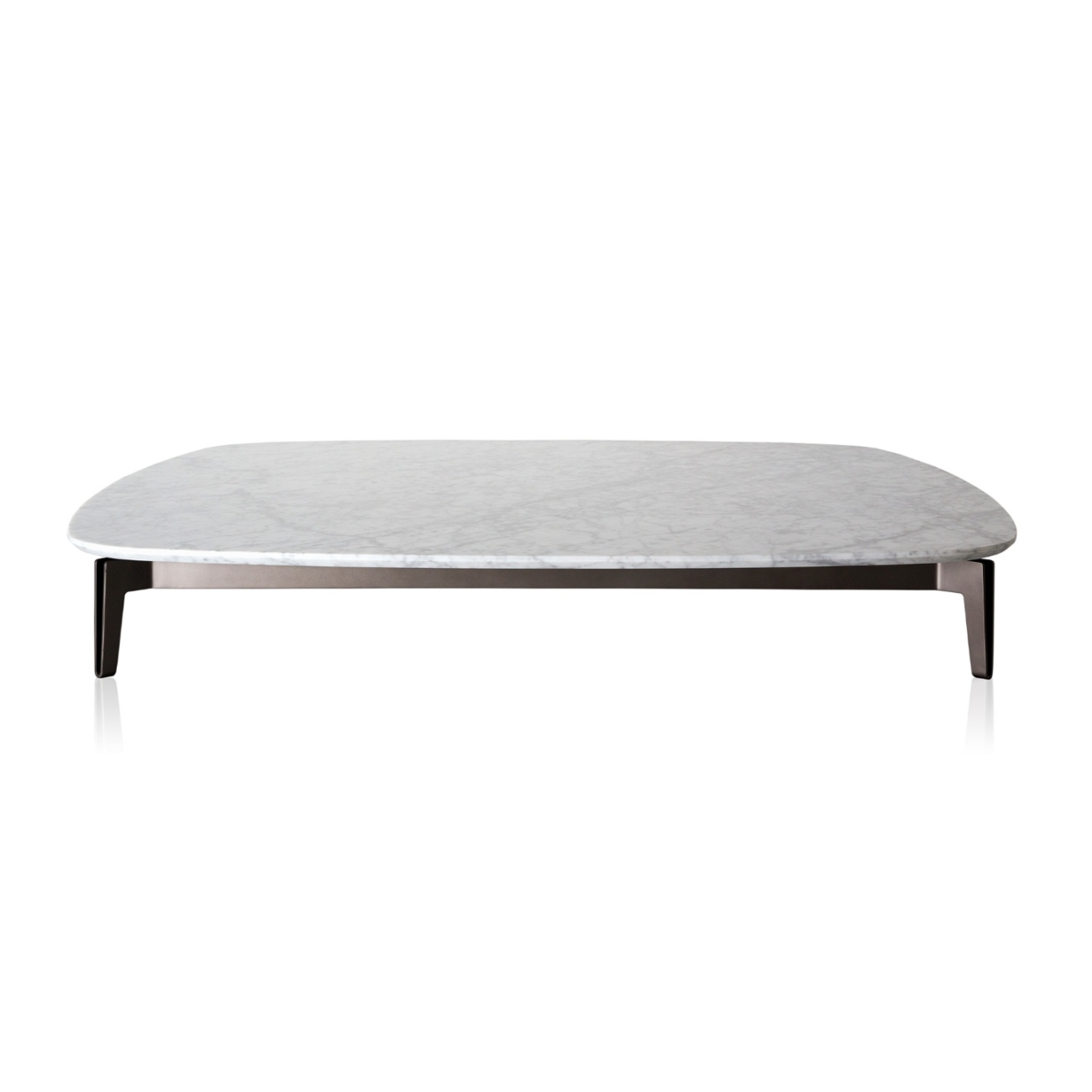 Leveza visual e solidez estão evidenciadas no traço preciso dessa composição. A lâmina de aço da estrutura parece realizar um movimento tangencial ao tampo, que por sua vez é feito de materiais nobres, como o mármore, o vidro e a madeira. Além disso, suas bordas são docemente arredondadas e as suas arestas suavemente chanfradas.